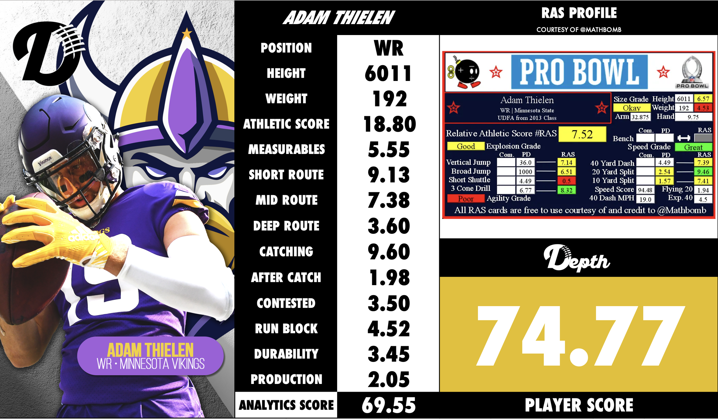 Adam Thielen was undrafted in the 2013 Class out of Minnesota State-Mankato. Thielen’s career is an excellent example of an undrafted player who made the most of every opportunity. His strengths—route‑running, hands, toughness, intelligence—have made him a long‑term productive receiver. His limitations—slightly less explosive speed, aging, and somewhat reduced big‑play upside—are manageable given his role and the value he brings. If used smartly, he remains a very valuable asset for his team.