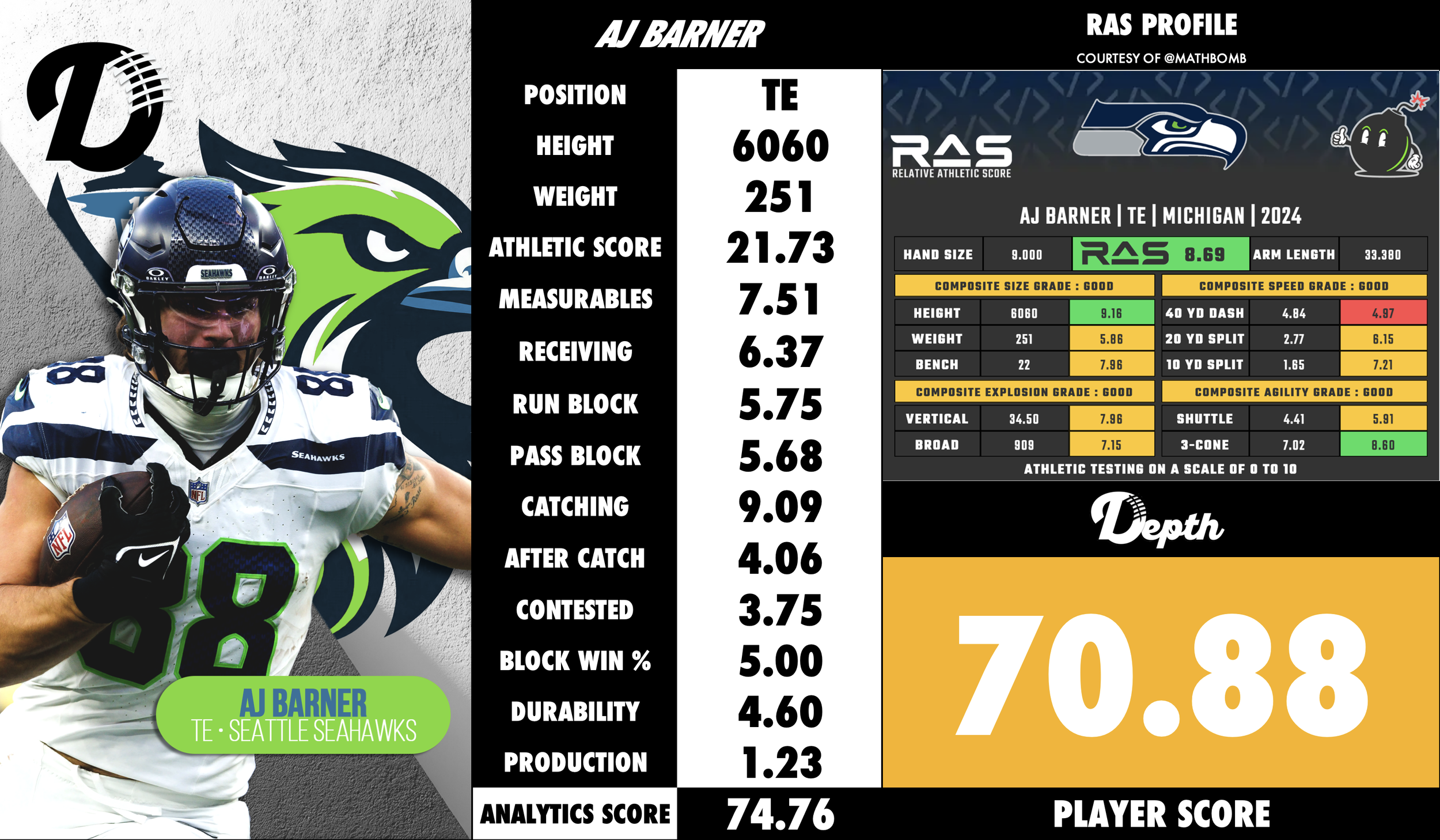 AJ Barner was selected in the 4th Round (#121 Overall) in the 2024 Draft out of University of Michigan. Barner offers a compelling blend of size, blocking proficiency, athleticism for his frame, and developmental upside in the receiving game. His standout strengths lie in his in-line blocking, physicality, catch-point ability, and versatility. His strongest developmental tasks center on honing his route-running, improving separation and burst, and gaining consistent production as a receiver. If he progresses well, he could become a valuable dual-threat TE; if not, he still brings meaningful value as a blocking tight end with situational receiving upside.