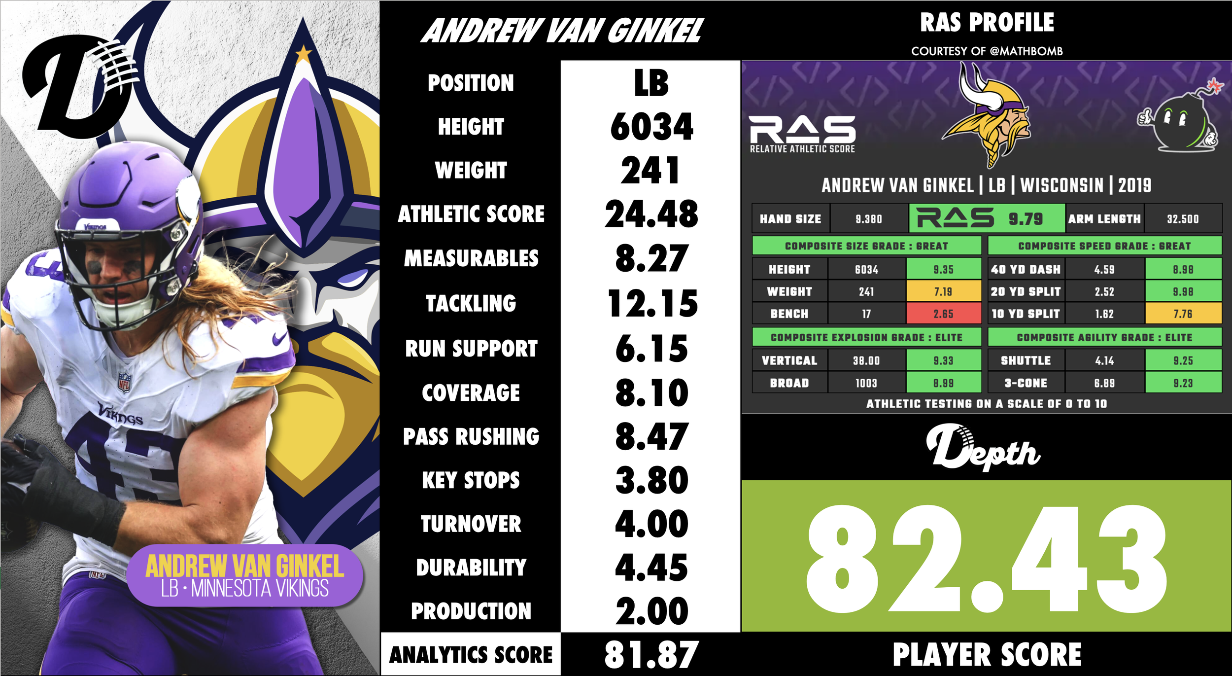 Andrew Van Ginkel was selected in the 5th Round (#151 Overall) in the 2019 Draft out of University of Wisconsin. Van Ginkel is a versatile edge defender with strong pass‑rush production, excellent athletic traits, and emerging leadership. His major strengths are his ability to generate pressure, length and speed, and versatility in the front. His primary limitations are his relative lack of elite bulk/anchor strength for power rush scenarios, some gaps in run‑defense consistency, and the challenge of sustaining every‑down performance. But if the positive trajectory continues, he could be a cornerstone piece for the Vikings’ defense for years to come.