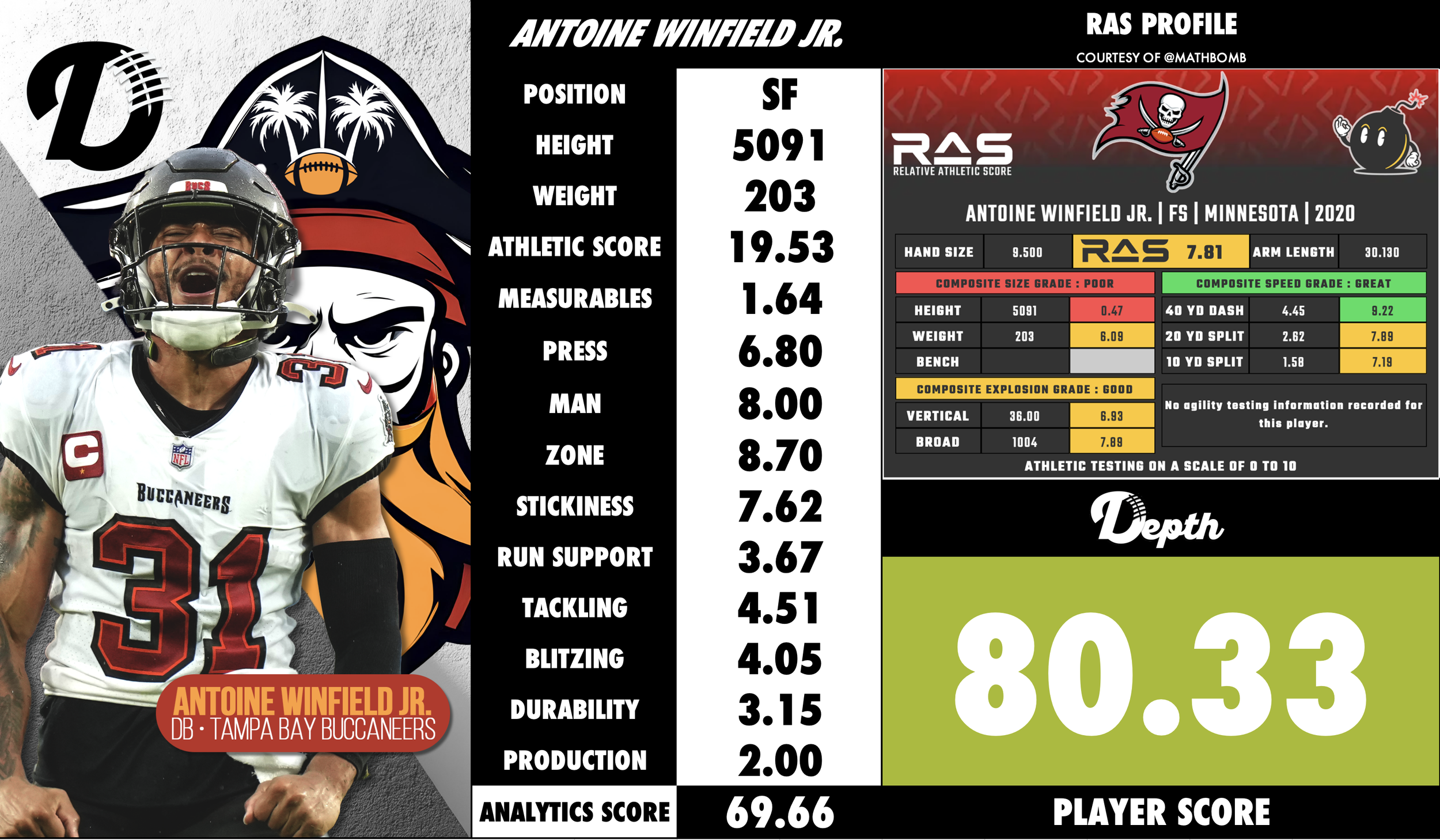 Winfield Jr. projects as a cornerstone defensive back for the Buccaneers. His high-level 2023 performance demonstrates he can be among the top safeties in the NFL when healthy and at his peak. While injuries and his smaller frame are potential risk factors, his football intelligence, leadership, and playmaking give him a high ceiling. If he maintains his physical health and continues his growth, he should remain a foundational piece of Tampa Bay’s secondary for years to come — capable of making splash plays, anchoring the back end, and contributing in high-leverage defensive situations.