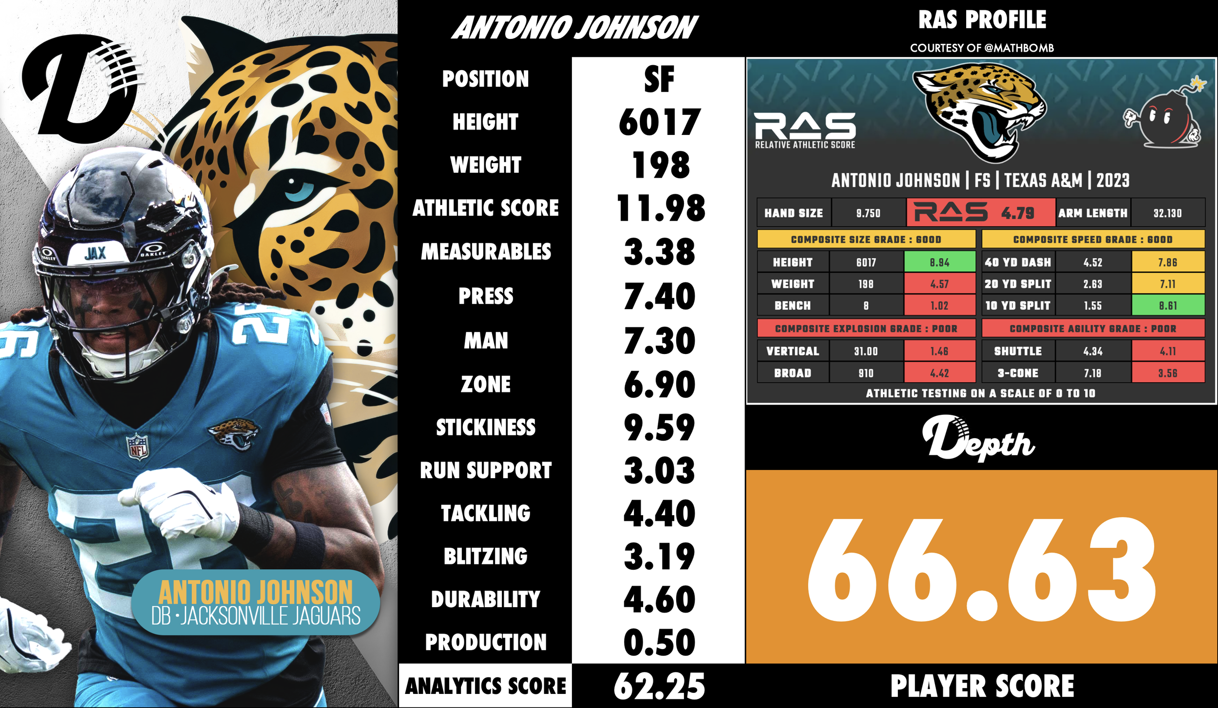 Antonio Johnson was selected in the 5th Round (#160 Overall) in the 2023 Draft out of Texas A&M University. Johnson offers a compelling blend of size, athleticism, and versatility in the defensive backfield. His standout traits include his hybrid coverage ability, strong run‑support play, and ball‑skill instincts. However, he must improve in deep coverage, increase his physical robustness, and crystallise his role to maximise his potential. With the right developmental track and scheme fit, he has the tools to evolve into a high‑impact NFL defender.