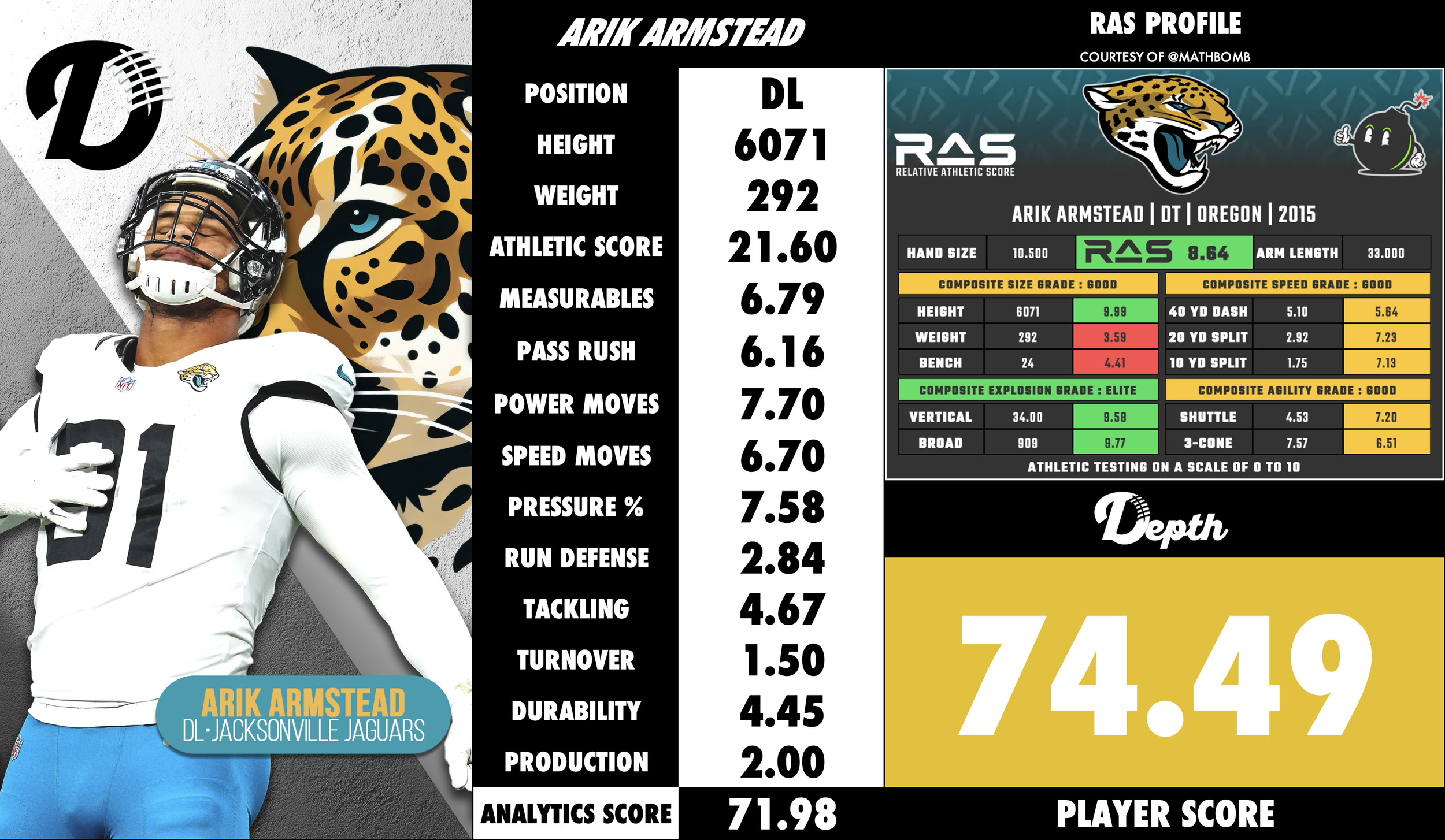 Arik Armstead was selected in the 1st Round (#17 Overall) in the 2015 Draft out of University of Oregon. A one-time Pro Bowler, Armstead is a rare blend of size, length, and athleticism for a defensive lineman, capable of playing multiple positions along the front. His strengths include versatility, pass-rush potential, and ability to disrupt both run and pass lanes. His main limitations are consistency, interior strength, and technique refinement. With continued focus on these areas, Armstead remains a foundational piece for a hybrid defensive front and a key contributor in high-level NFL defenses.