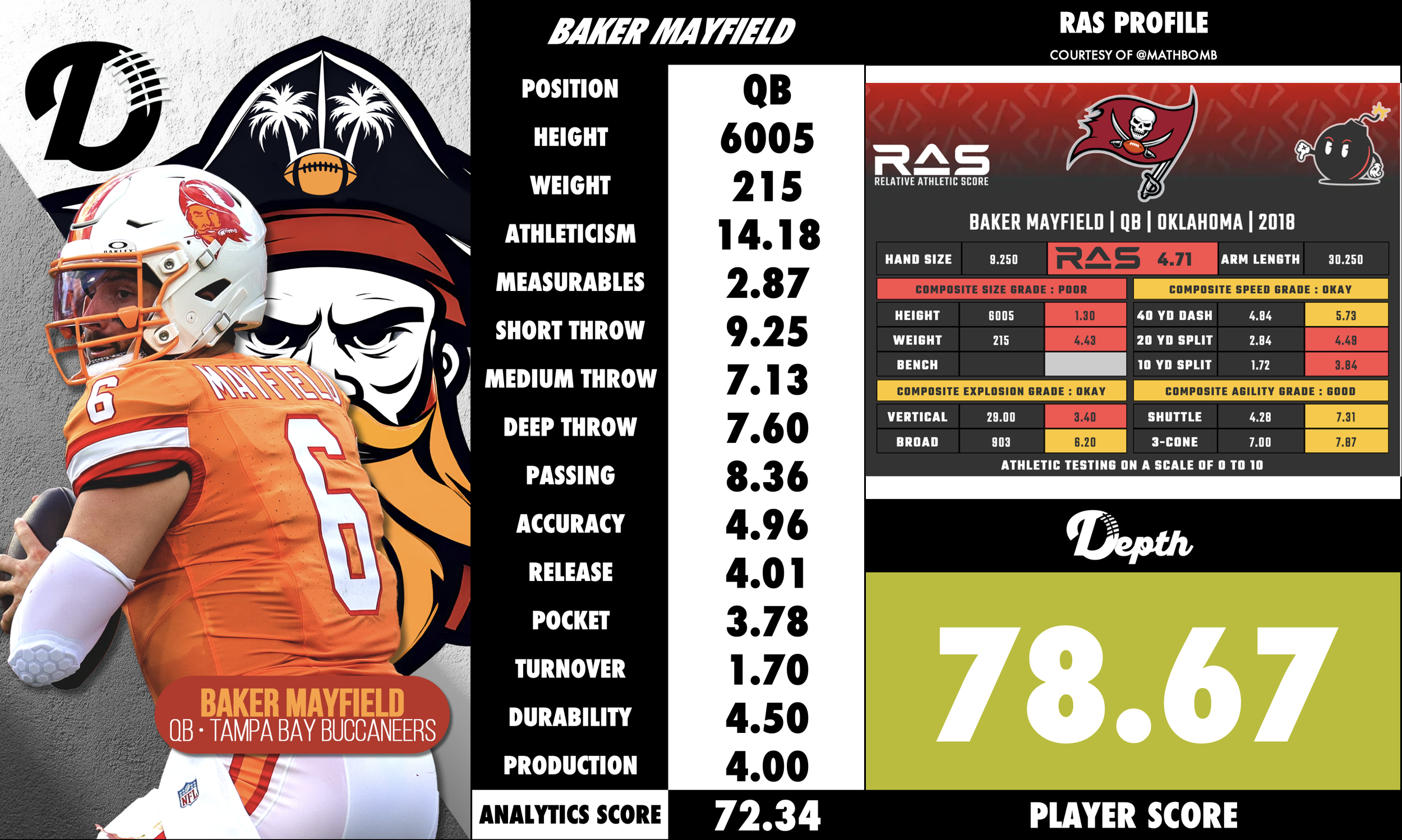 Baker Mayfield brings many of the traits you want in a modern NFL quarterback — arm strength, competitiveness, mobility, and a proven recent production uptick. His main challenges lie in consistency (especially on riskier throws), having optimal size/vision traits, and playing in a system and with personnel that suit his style. When things are right, he can be a difference-maker; when they’re not, his weaker spots may become more evident.