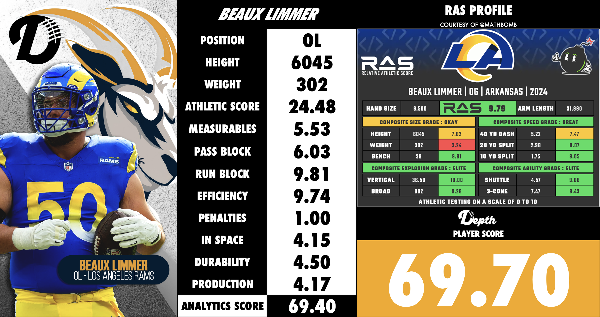 Beaux Limmer was selected in Round 6 (#217 Overall) out of University of Arkansas. Limmer is an interior offensive lineman who spent the bulk of his college career at guard before shifting to center in his final season. He brings strong athleticism, good movement skills for his size, and demonstrated the ability to handle multiple interior positions in the SEC. His profile shows promise as a versatile depth or developmental starter on the interior, though questions remain about his anchor strength, arm length and suitability for certain power‑block schemes.