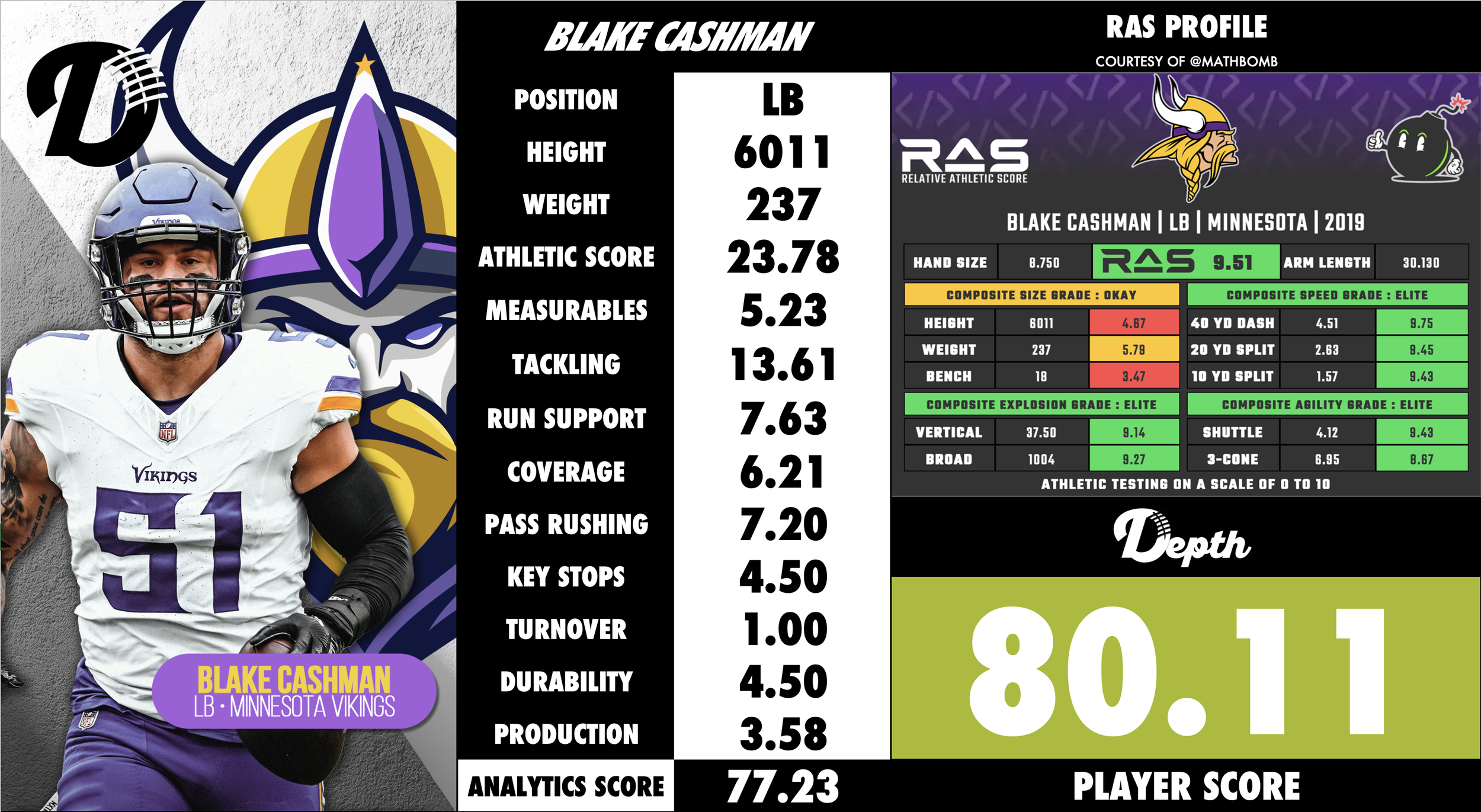 Blake Cashman was selected in the 5th Round (#157 Overall) of the 2019 Draft out of University of Minnesota. Cashman offers a strong combination of athleticism, good coverage skills for a linebacker, high effort and production in space, and versatility. His main constraints are his somewhat smaller frame for inside battles, power/run-game finishing, and durability. If he plays in a system that aligns with his strengths and continues to refine his areas of weakness, he should continue to be a meaningful contributor. If those limitations aren’t addressed, he may settle into more of a specialized rather than full-every-down role.
