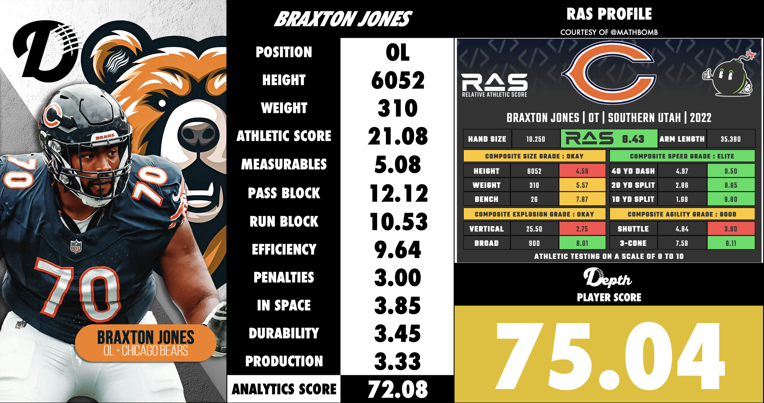 Braxton Jones is an offensive tackle for the Chicago Bears in the NFL. He was selected in the 5th round (168th overall) of the 2022 NFL Draft from Southern Utah Thunderbirds after a standout collegiate career. NFL.com At approximately 6’5″ and 303 lbs, he became the Bears’ starting left tackle as a rookie, impressively starting all 17 games in 2022. Chicago Bears