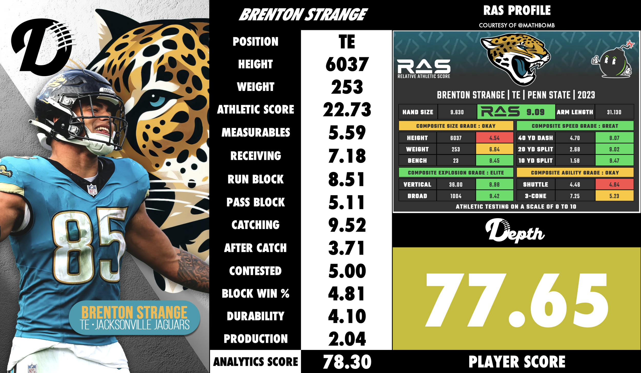 Limited production so far in the NFL Prior to 2025, he’s been more of a rotational TE2/TE3 behind Evan Engram, with flashes but not consistent offensive involvement. Strange was on the cusp of a breakout season in 2025 under new Head Coach Liam Coen until getting derailed by a hip injury that landed him on injured reserve.