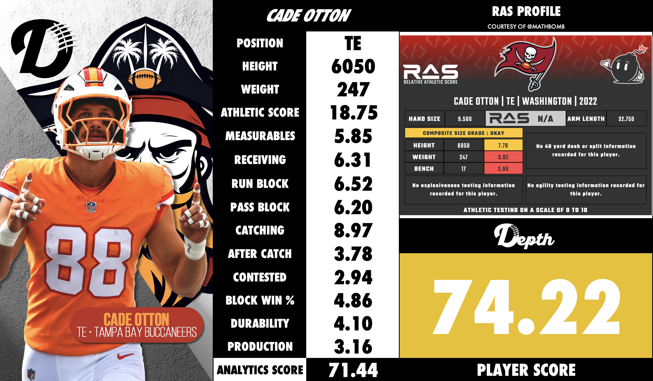 Cade Otton was selected in the 4th round (106th overall) of the 2022 NFL Draft by the Tampa Bay Buccaneers. Tampa Bay Buccaneers He played college football at Washington, where he totaled 91 catches for 1,062 yards and 9 touchdowns over his career. SI In 2020, he earned First‑Team All‑Pac‑12 honors. Tampa Bay Buccaneers In the NFL, Otton has proven to be a reliable two-way tight end, contributing as both a blocker and a receiving threat. According to his bio, he consistently gained the trust of his coaching staff, playing a high percentage of offensive snaps and earning a reputation for being “Mr. Reliable.” Tampa Bay Buccaneers Known for his toughness, high football IQ, and strong work ethic, he brings size (6′5″, ~247 lbs) plus good route-running and blocking ability. NFL Mocks