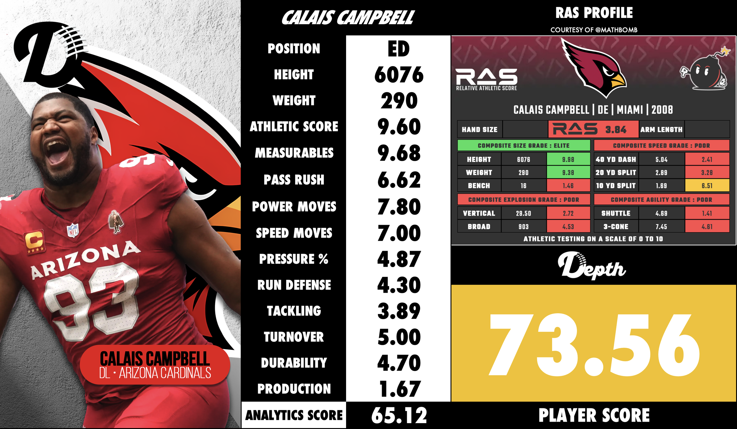 Calais Campbell was drafted in the 2nd round (50th overall) of the 2008 NFL Draft by the Arizona Cardinals. Pro Football Reference He played college football at Miami (FL). Over his long and productive NFL career, Campbell has recorded 110.5 sacks, 917+ tackles, and 266 quarterback hits, per the Cardinals’ 2025 media guide. NFL He's a 6× Pro Bowler, a First‑Team All-Pro in 2017, and has received significant honors off the field (e.g., 2019 Walter Payton Man of the Year). Pro Football Reference Known for his rare combination of size (6'8", ~315 lb), athleticism, leadership, and longevity, Campbell is widely respected as a cornerstone veteran presence and a locker-room leader. CBS Sports