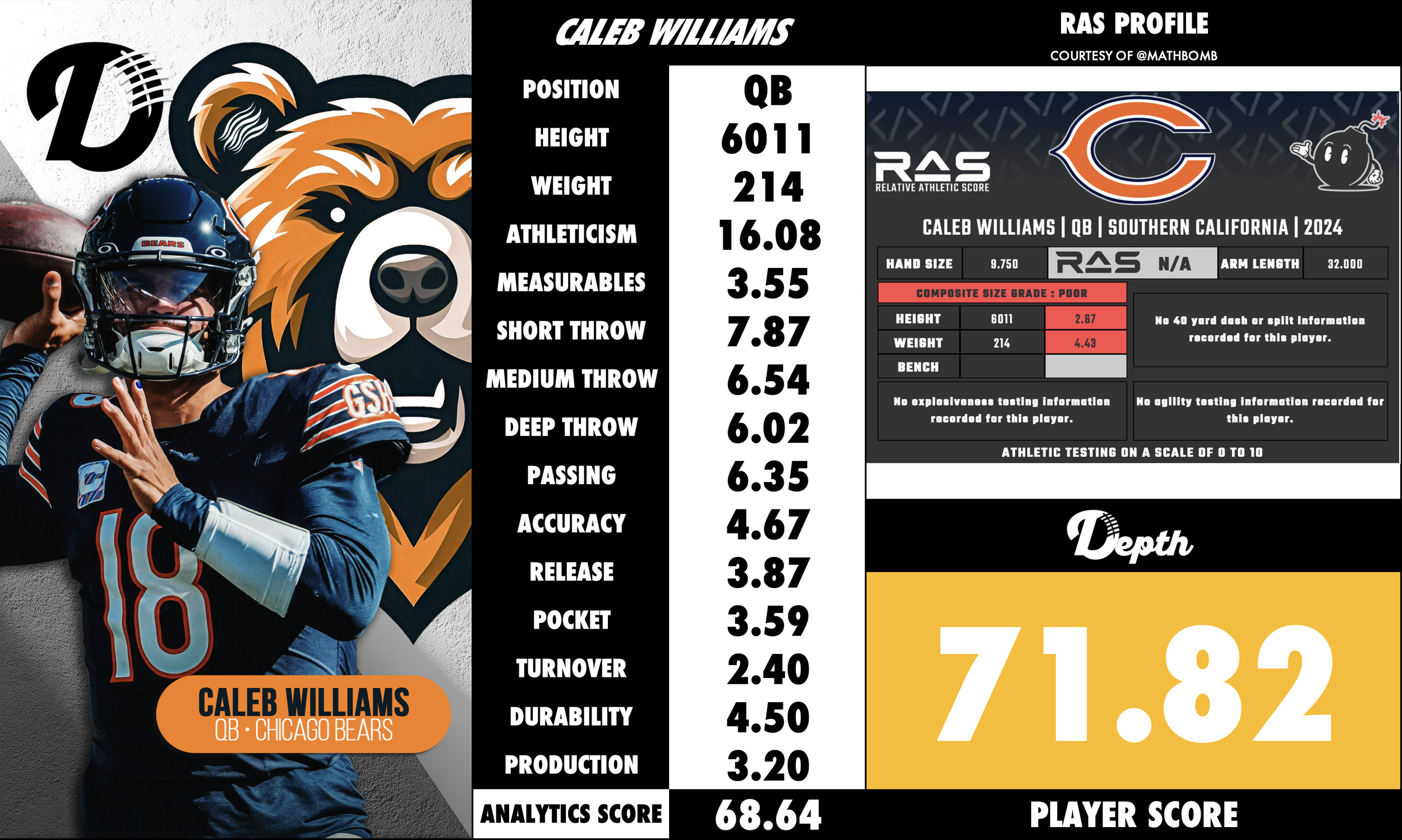 Williams was selected first overall out of University of Southern California (USC) in 2024. Caleb Williams is a dynamic and highly talented young quarterback who already has a lot of tools in his toolbox. His athleticism, passing ability and winning pedigree give him a high ceiling. The keys for him will be continued growth in the pro game, improving consistency, and ensuring the team around him helps maximize his strengths and cover his weaknesses.