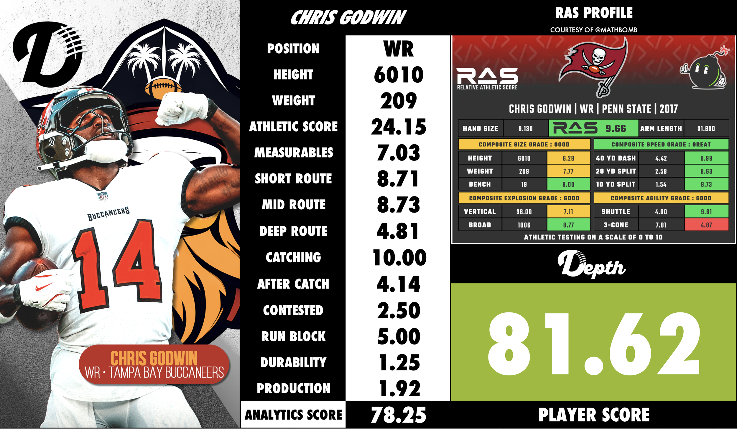 Looking ahead, Godwin’s outlook remains very solid. Despite injury history, his high football IQ, proven production, and character give him a high floor as a dependable top-2 receiver. If he stays healthy, he can continue to be a major part of the offense in his prime years, especially in critical-game situations. Over time, he may lean more into savvy route work, positional leverage, and red-zone target share rather than relying solely on speed, but his skill set is versatile enough to maintain a high level of impact in the league.