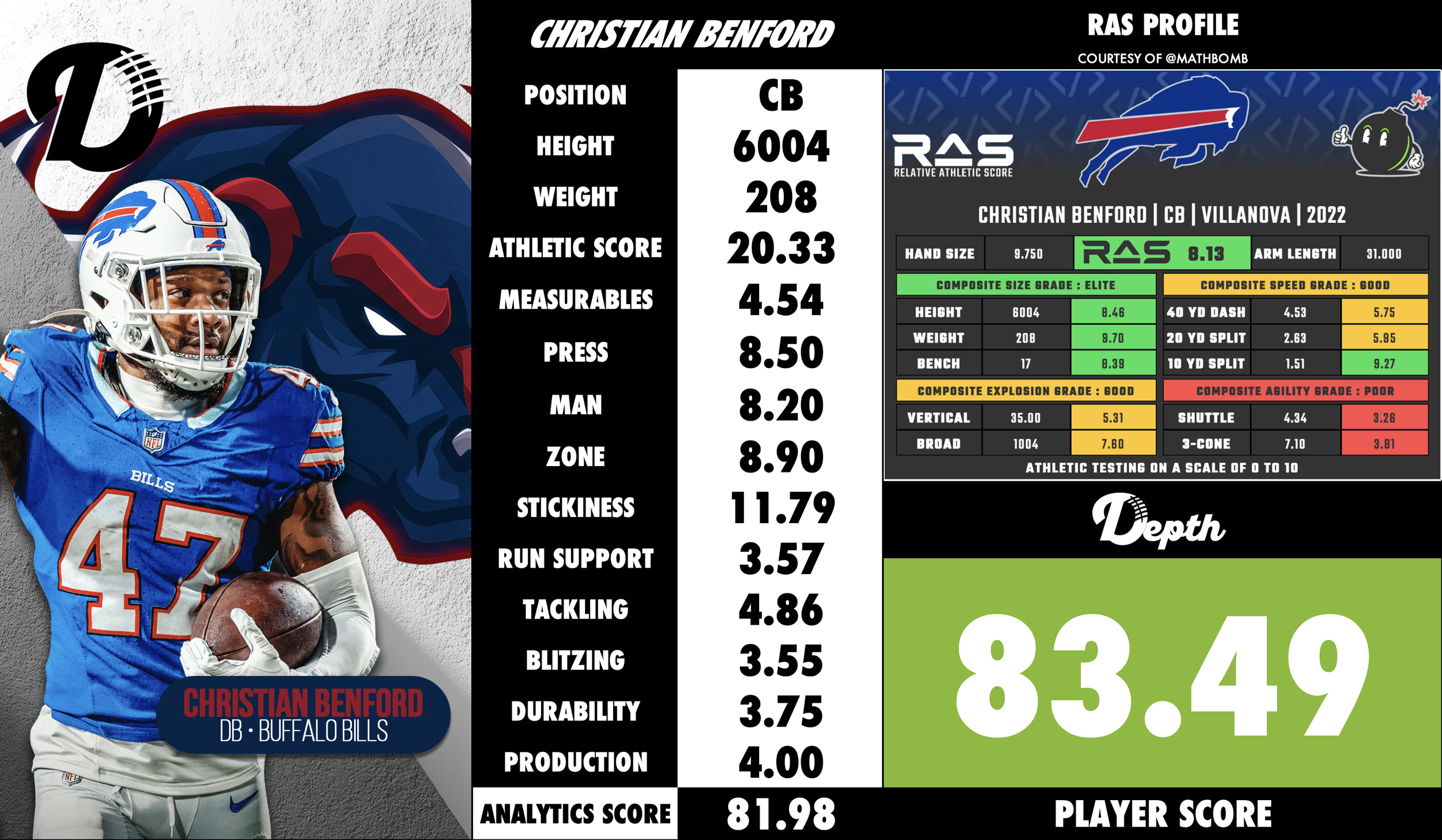 Benford’s game is built on strong zone awareness, good size for a boundary corner, and an increasing ability to create turnovers and influence the passing game. He has become a key piece in the Bills’ secondary and a player the team is willing to invest heavily in for the long term.