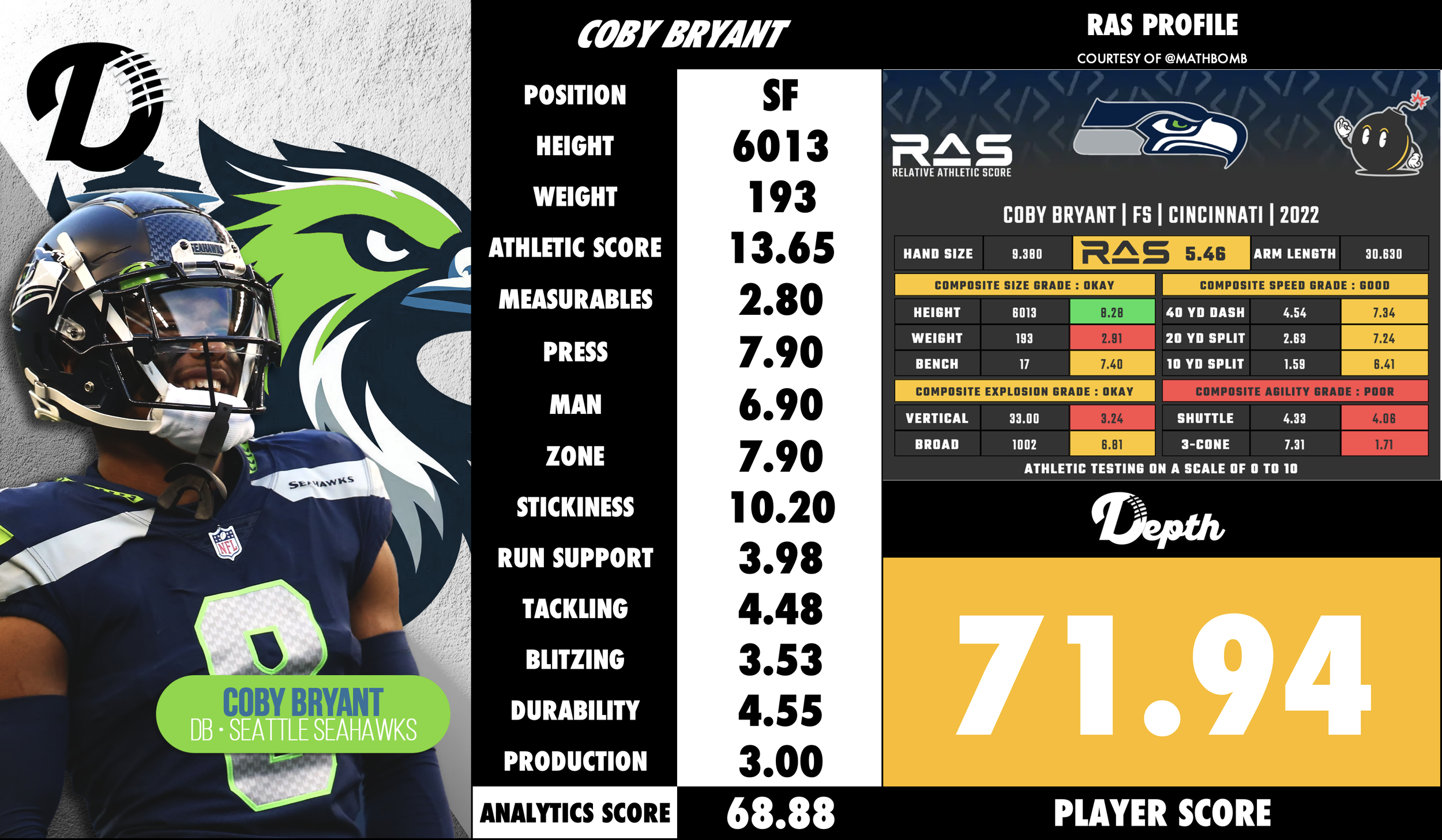 Coby Bryant was selected in the 4th Round (#109 Overall) in the 2022 Draft out of University of Cincinnati. Bryant is a strong young defensive back whose strengths lie in his instincts, playmaking ability, versatility, and physical tackling. He has already demonstrated that he can produce at the NFL level in a starting role. His areas of improvement—agility/quickness, technique polish, and handling more physical matchups—are manageable and typical for a player still early in his pro career. With continued development, he carries the profile of a rising impact defender rather than a limited specialty piece.