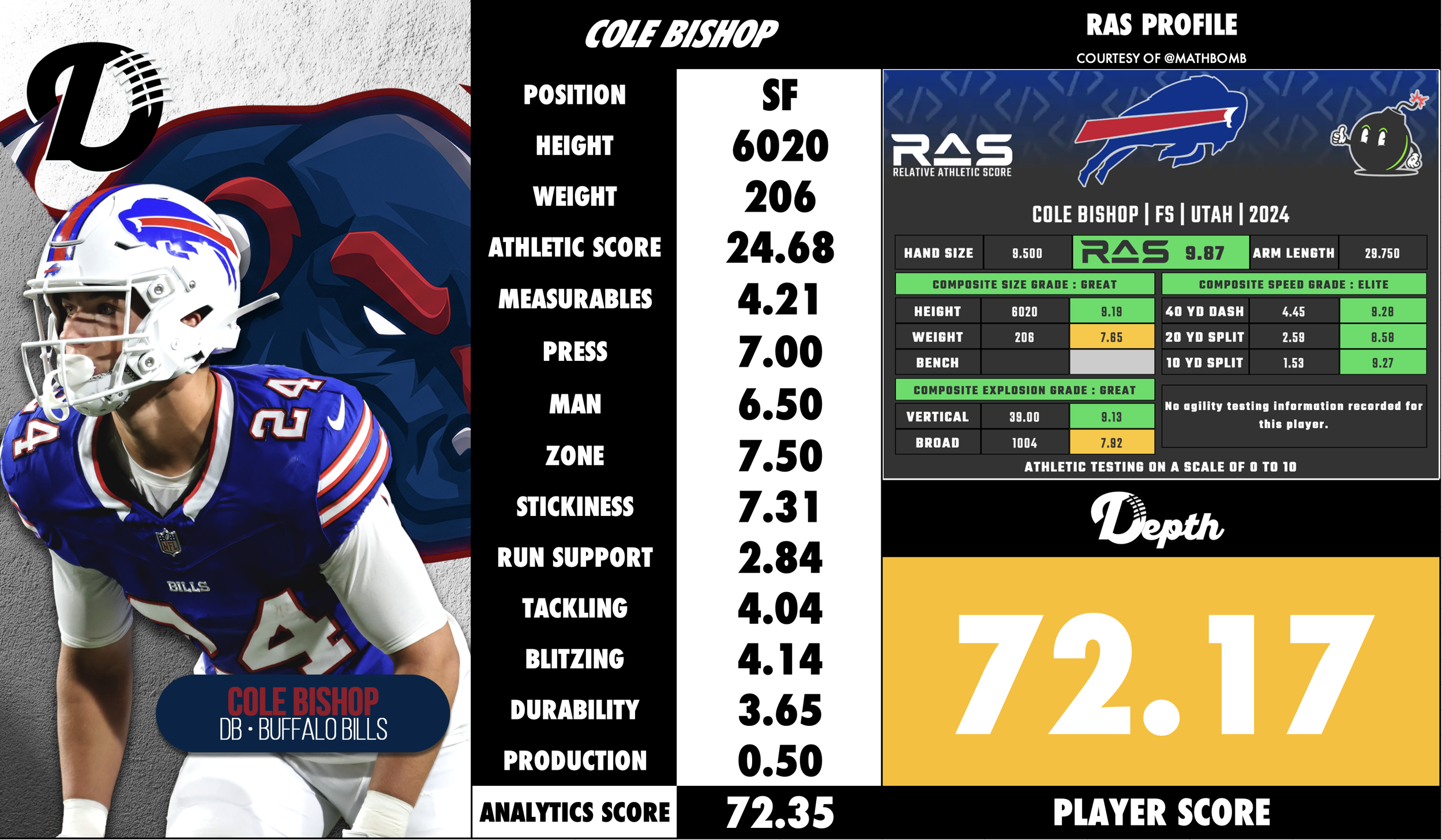 Athleticism & range for the safety position: At ~6′2″ / 207 lbs, he has the size and movement ability to cover the field, which gives him versatility in both deep zones and near the line of scrimmage. Buffalo Bills