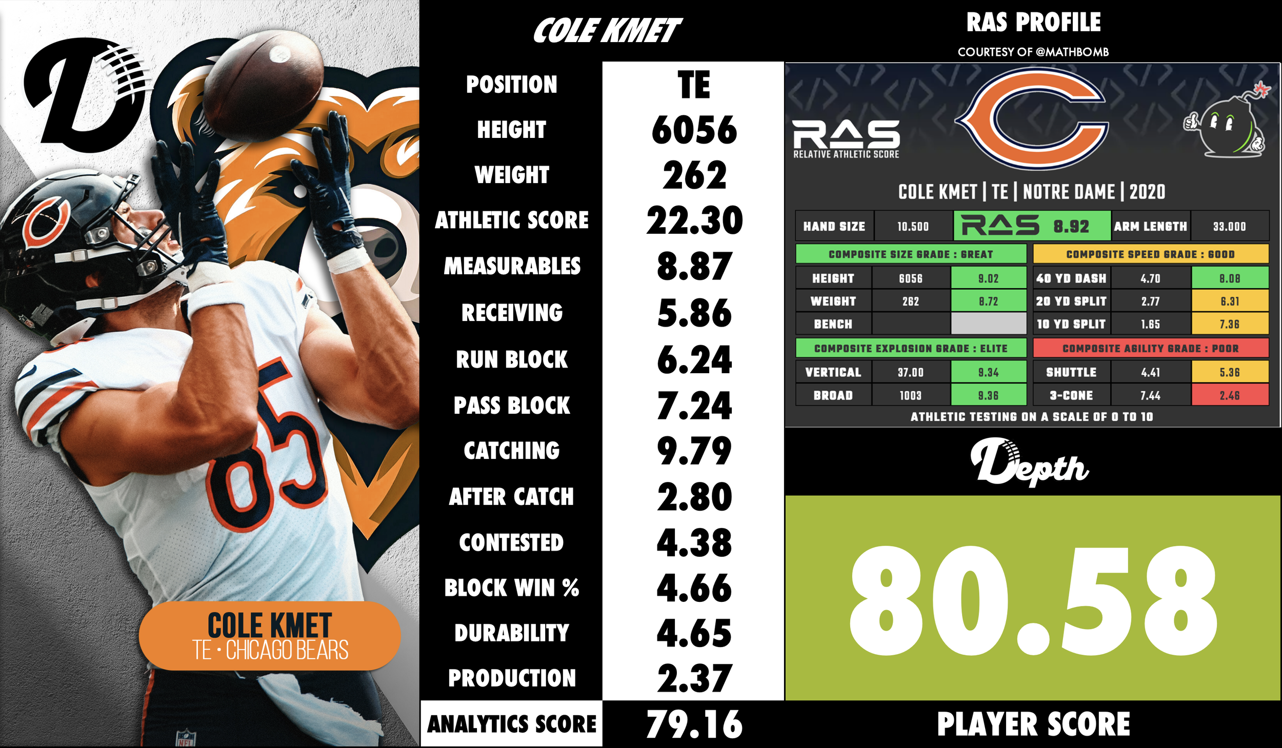 Standing about 6′6″ and ~262 lbs, Kmet offers a rare combination of size, length and versatility at the position. CBS Sports