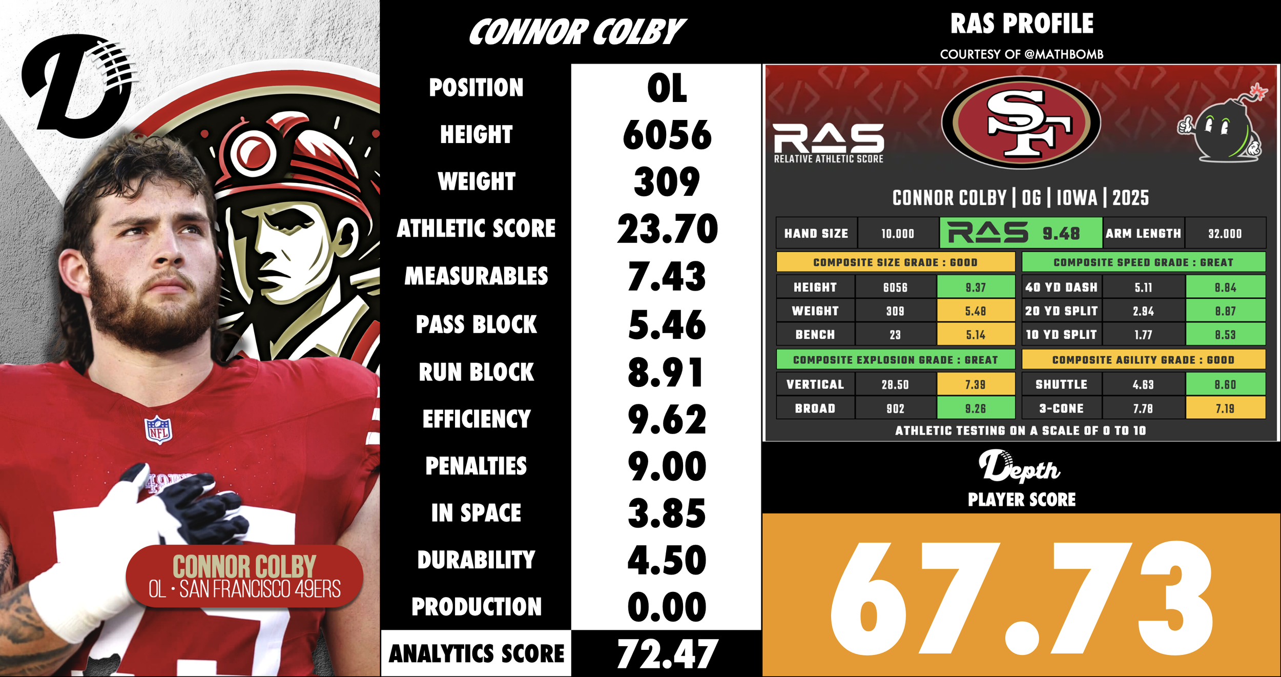 Scouts and team reports suggest Colby played in systems similar to San Francisco’s run-scheme, which should ease his transition. SISize and physical attributes