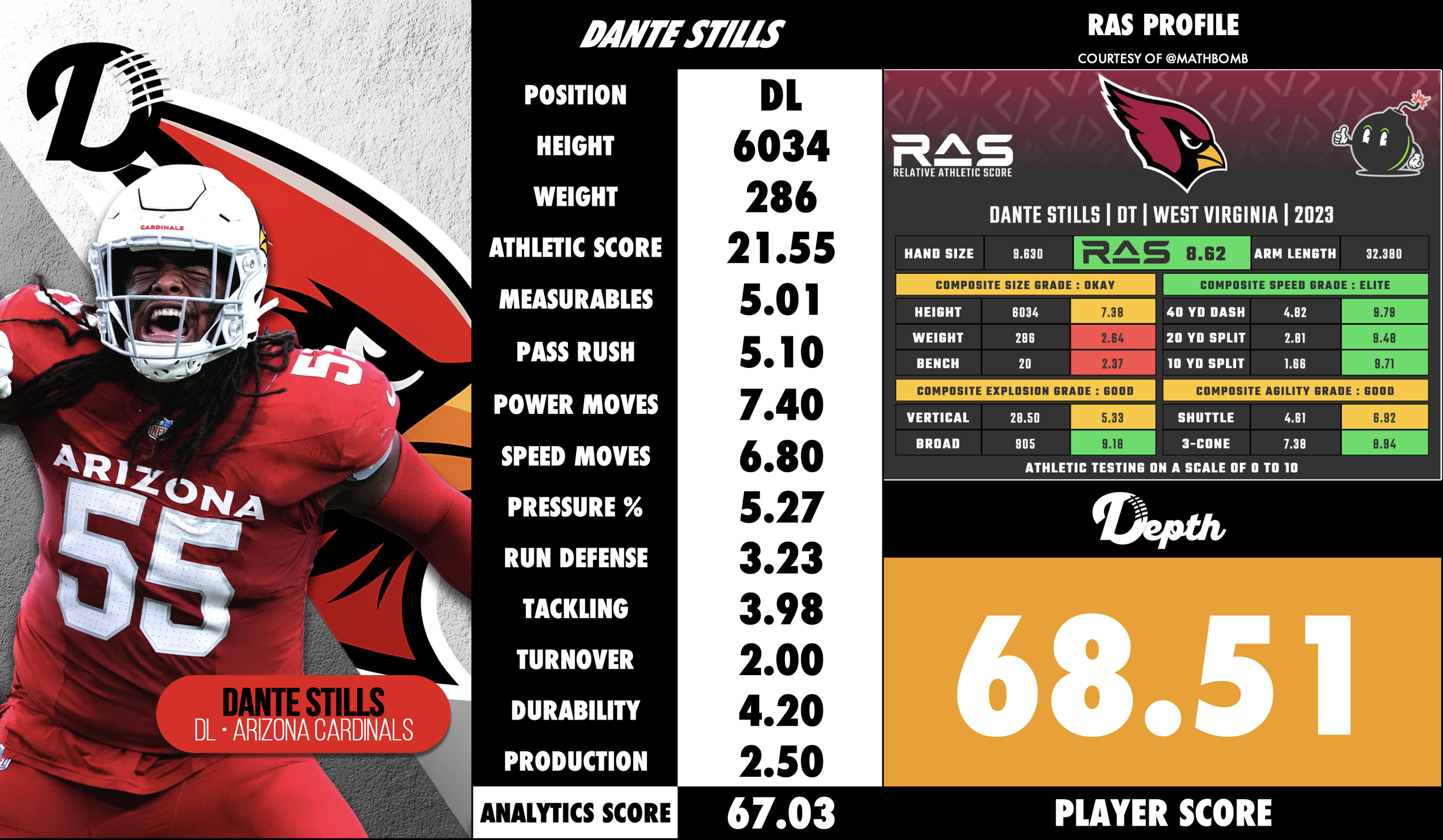 Dante Stills projects as a high-upside rotational defensive lineman in the NFL who could develop into a three-down contributor. His best fit is likely in a defense that values active, penetrating interior linemen — particularly in schemes that can deploy him as a one-gap rusher or in twisting fronts where his hand skills and burst can be maximized. For the Arizona Cardinals, Stills has the potential to grow into a significant role over time, especially if he continues to add strength and refine his pass-rush counter moves. While he may not immediately be a star, his combination of motor, technique, and natural talent gives him a path to be a disruptive piece in the defensive front.