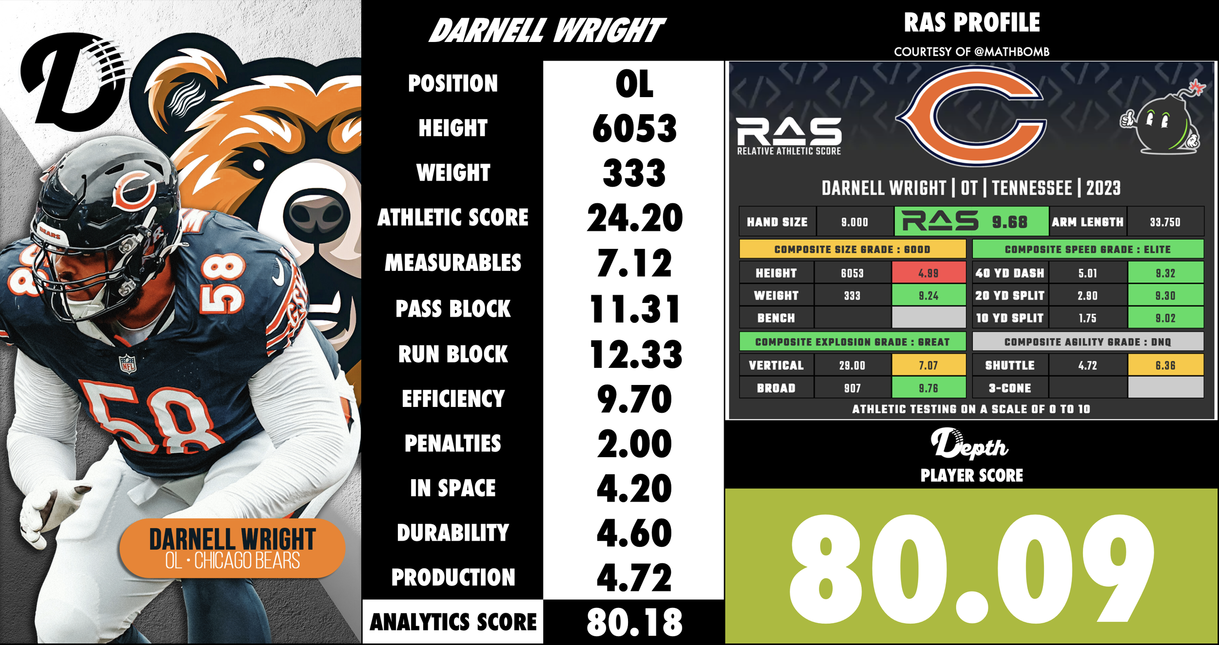 Short-Term: Wright is expected to be a starter from early in his career for the Bears. With his size, strength and pass-protect background, he should help improve the right tackle position and stabilize protection for the quarterback.