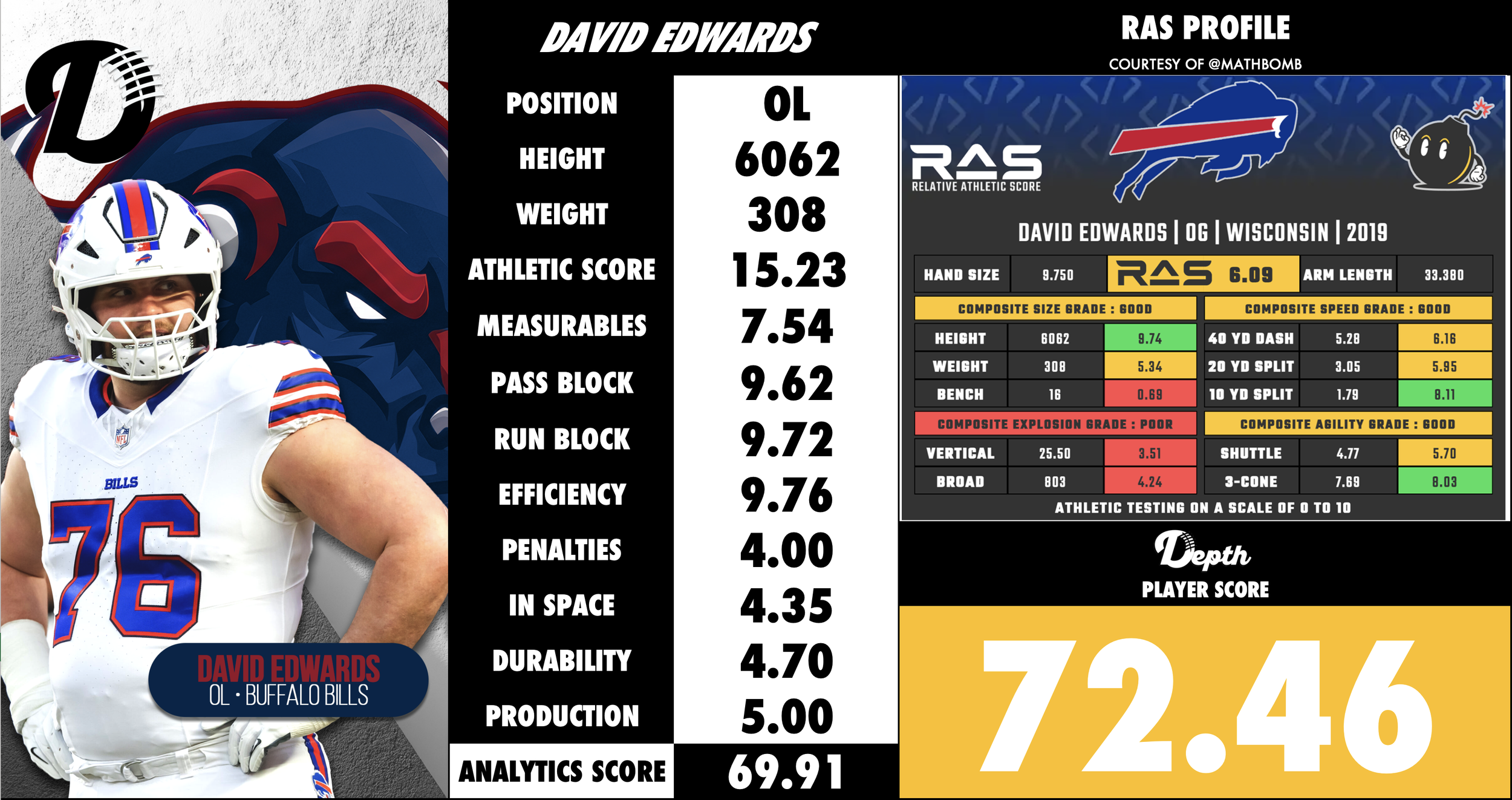 Edwards projects as a valuable depth-to-starter-caliber guard who can anchor a line in stretches and maintain consistent performance when needed. As long as he stays healthy, he should continue to be a trusted veteran presence in Buffalo’s offensive rotation. While unlikely to ascend into Pro Bowl status, he’s a reliable, coachable, and durable component of a championship-caliber roster.