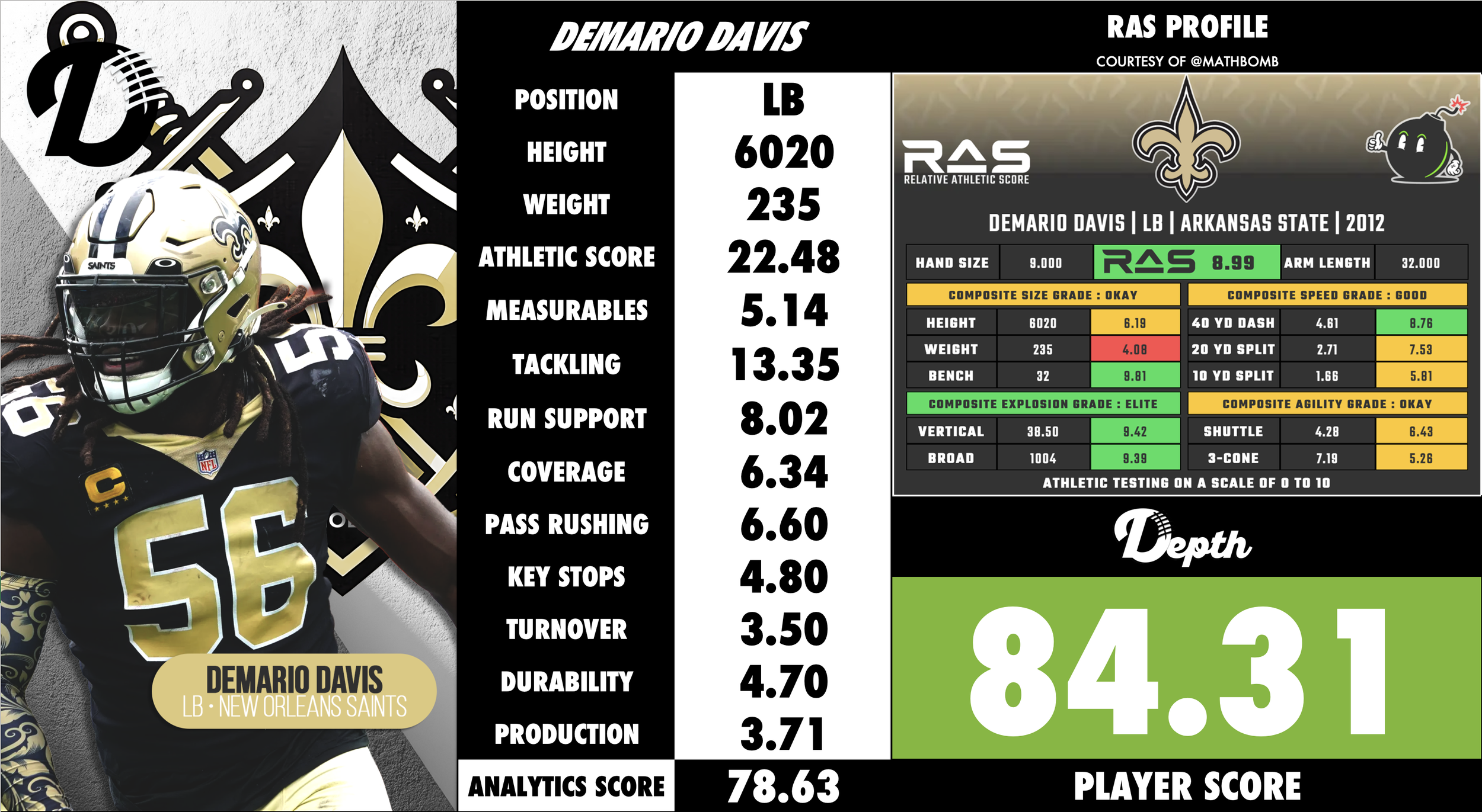 Davis fits extremely well in defenses that value athletic linebackers who can handle multiple responsibilities: stop the run, cover space, and be a defensive leader. With the Saints, he has been the anchor of the linebacking unit and a key contributor to their defensive success. Looking ahead, provided he maintains his health and adapts to the physical demands of the position, Davis is positioned to continue being a high‑impact starter. His floor remains that of a reliable, productive linebacker; his ceiling is being among the very best in his role if he continues to refine his craft and physical conditioning.