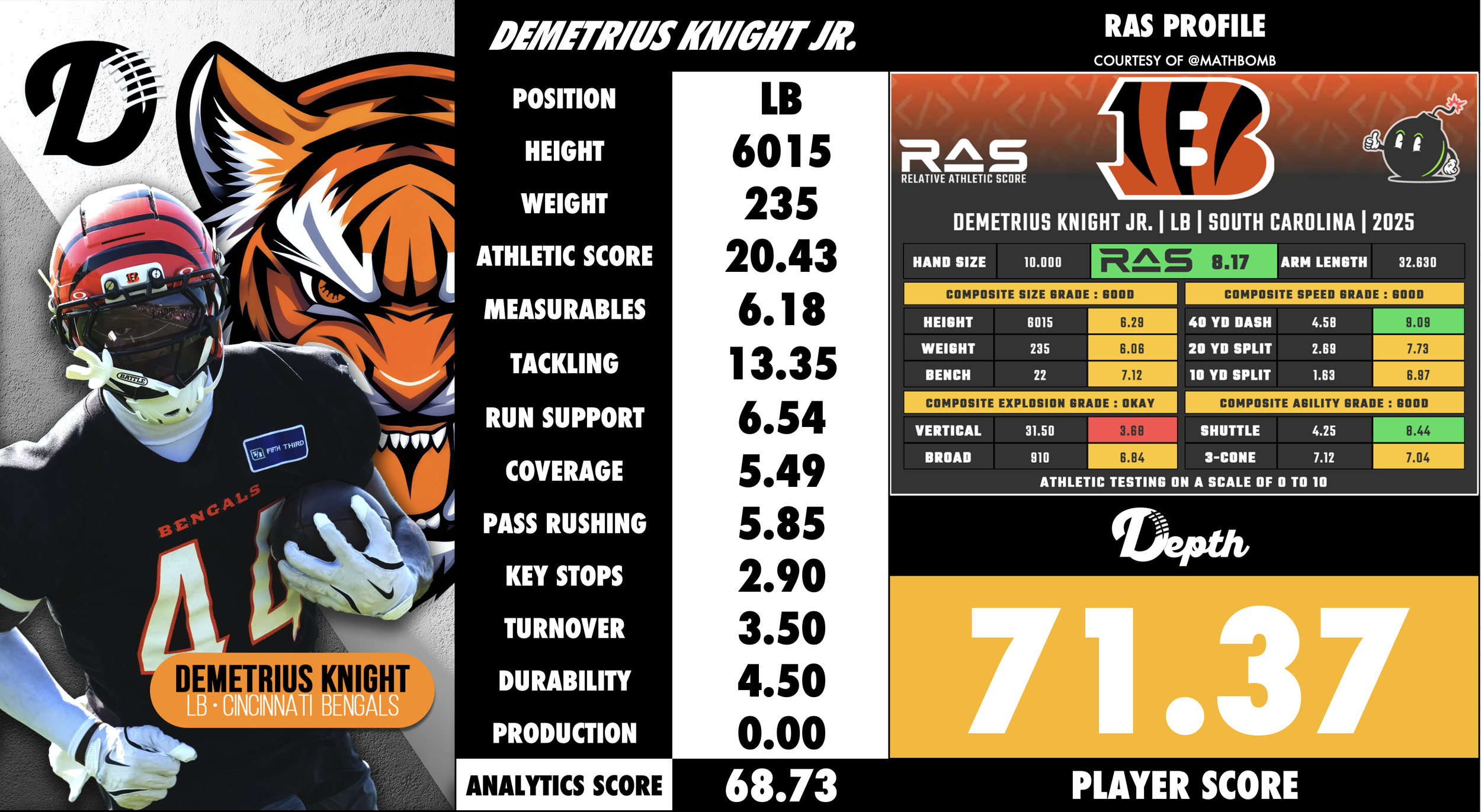 Demetrius Knight Jr. projects as a high-floor, early-impact linebacker for the Bengals, especially in a defense that values physicality, run stopping, and blitzing from the second level. In the right scheme, he could earn significant playing time early, likely in sub-packages and on special teams, with a chance to grow into a full-time role if his coverage skills and open-space agility improve.