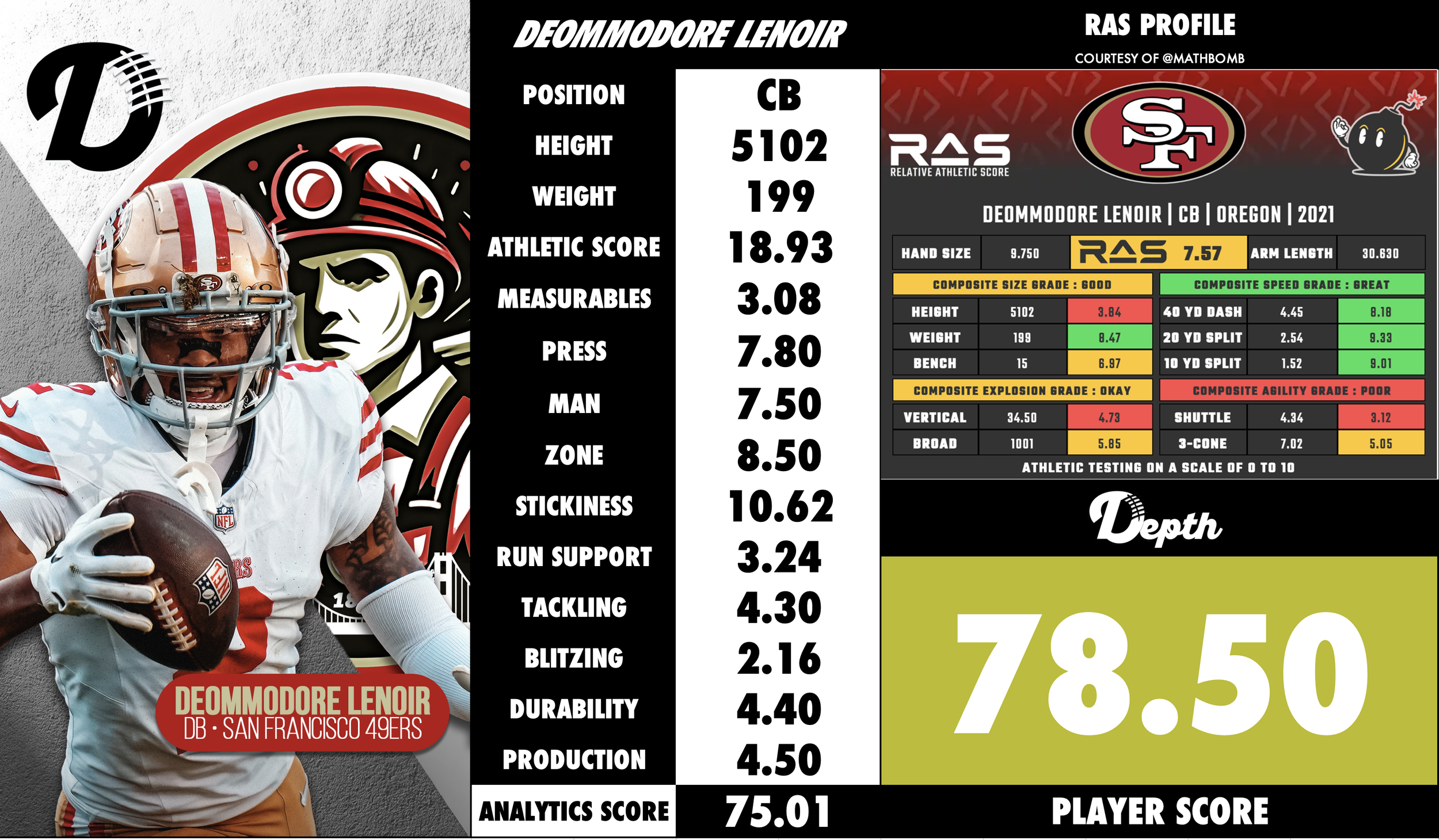 Deommodore Lenoir has grown from a 5th-round pick into a starting cornerback with meaningful responsibilities. His physical style, adaptability and emerging playmaking give him a substantive floor. If he continues to refine his technique (especially release, transition, deep speed recognition) and stays healthy, his ceiling is a dependable, above-average cornerback capable of handling a variety of assignments in a top defense.