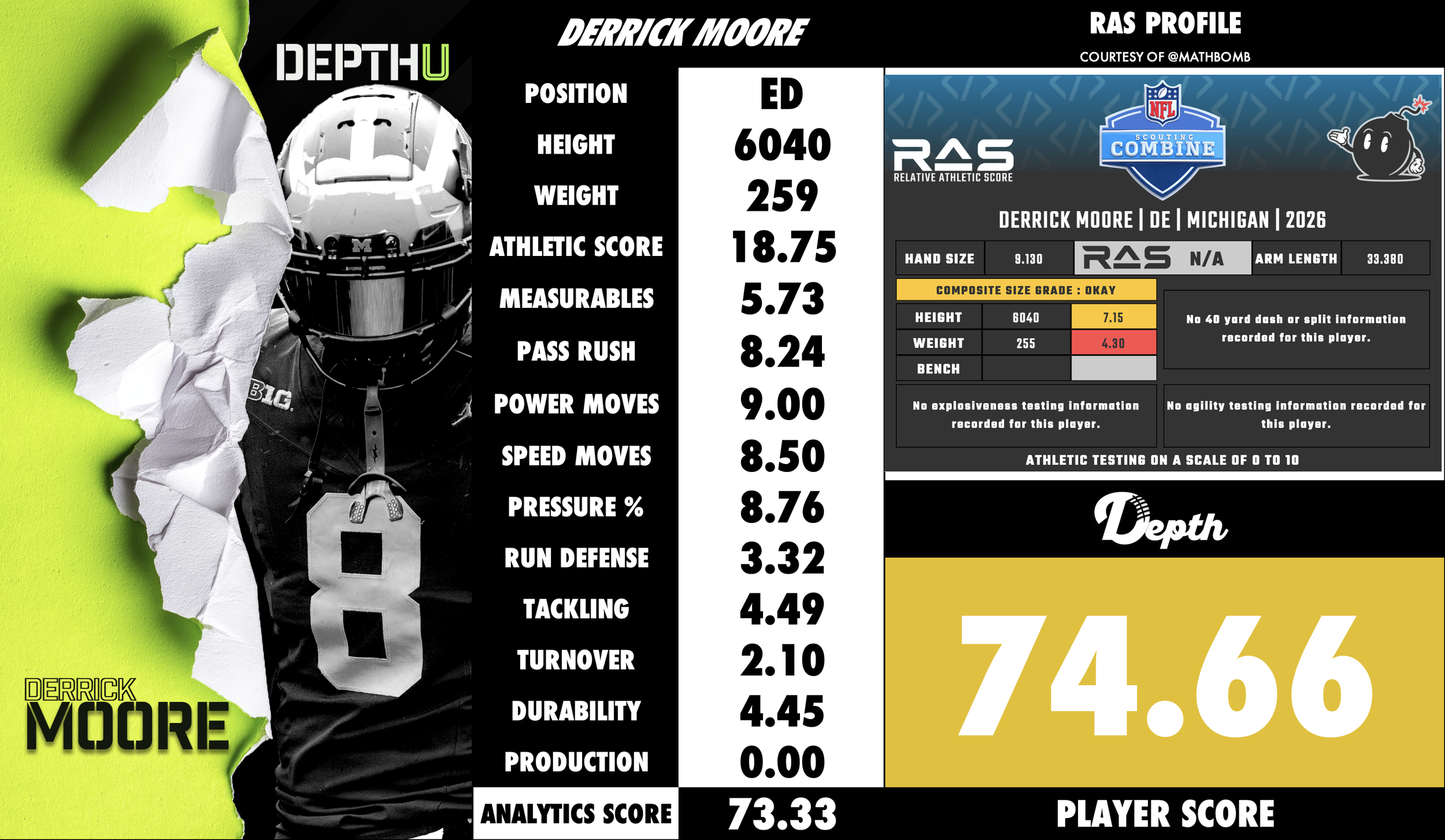 Derrick Moore (21 years old) is a defensive end who has played his entire college career at Michigan with no transfers. In 2025, Moore started throughout the season and recorded 46 total tackles, 12.5 tackles for loss, and 8.5 sacks, earning him First-Team All-Big Ten honors and All-America consideration. Moore has maintained solid academic standing and is widely viewed as a high-motor, team-oriented defender whose physicality and practice habits consistently draw praise from the coaching staff, with no publicly reported significant off-field incidents. Teammates point to his steady development and willingness to embrace coaching as indicators of his maturity and long-term upside. From an injury standpoint, Moore has been durable throughout his career, with no major injuries causing extended absences, reinforcing his reliability as an every-down defensive end.
