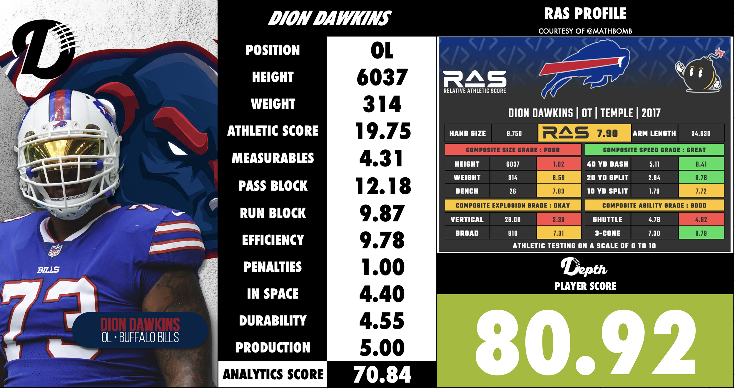 While traditionally the left tackle position demands elite athleticism, Dawkins’ game blends power, agility, and length in a way that gives him a high floor. As he enters the later stage of his career, his role remains vital for Buffalo’s success, particularly in passing situations and in giving Josh Allen the time to make plays.