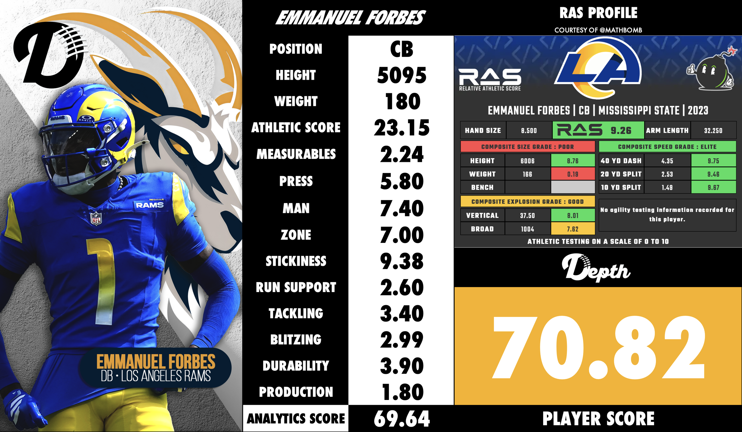 Emmanuel Forbes was selected in Round 1 (#16 Overall) in the 2023 Draft out of Mississippi State University. Forbes entered the league as a highly athletic, ball‑hawking cornerback with noteworthy speed (4.35 sec 40‑yard dash) and a knack for making splash plays with his six career interception returns for touchdowns, an FBS record. At roughly 6′1″ in height but listed at around 166‑180 lbs at the time of draft, his frame represented a major question mark. His college tape showcased excellent ability in zone, strong instincts and ball skills—but concerns centred on his physicality, run‑support capability, and how his size would translate to the pro level.