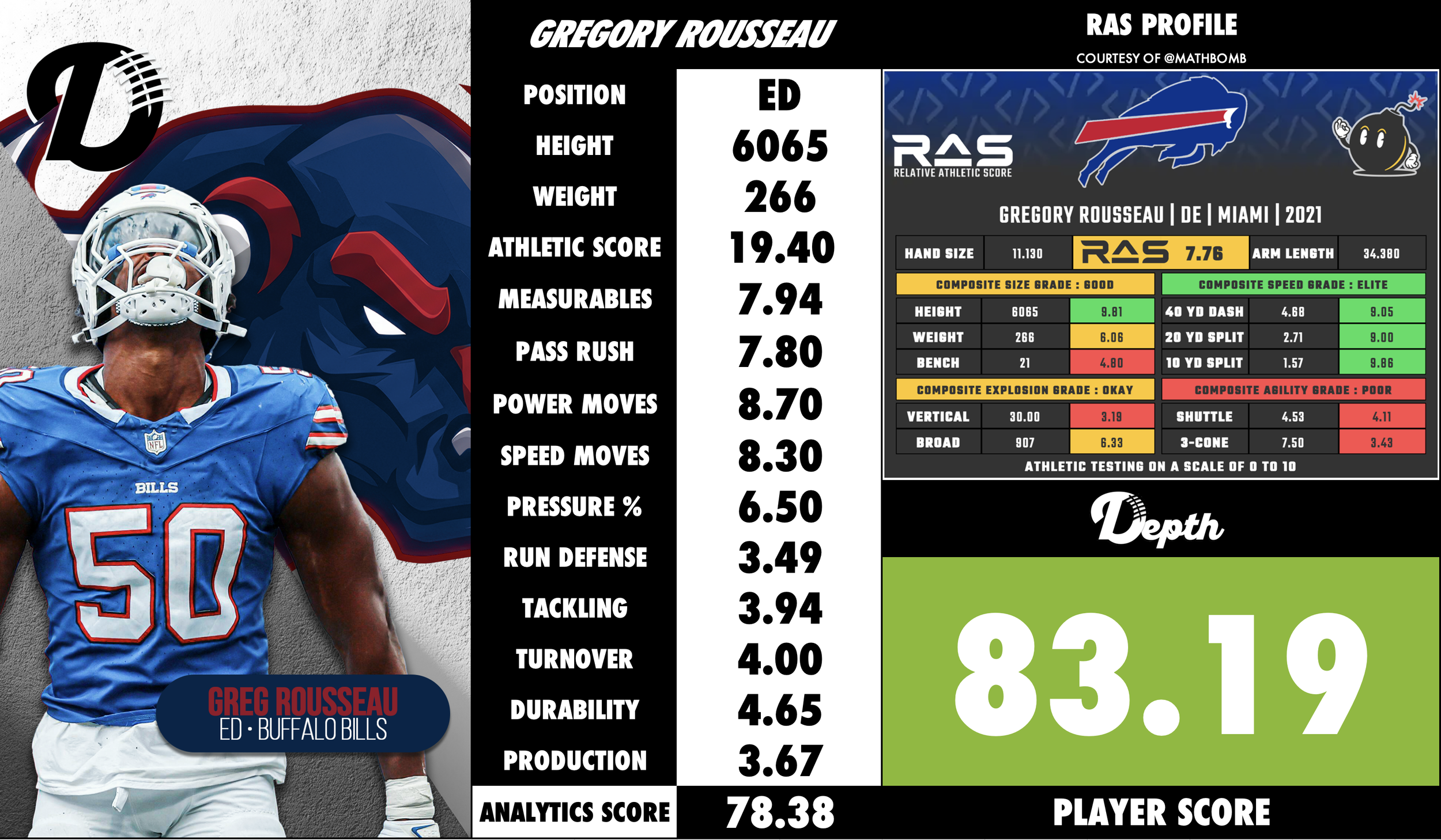 If he continues to improve his technique and stays healthy, Rousseau has the potential to become one of the more impactful edge players in the league—someone who can consistently threaten double-digit sacks and affect blocking schemes. On the flip side, if the development stalls or injuries mount, his ceiling may settle as a solid starter rather than a dominant one.