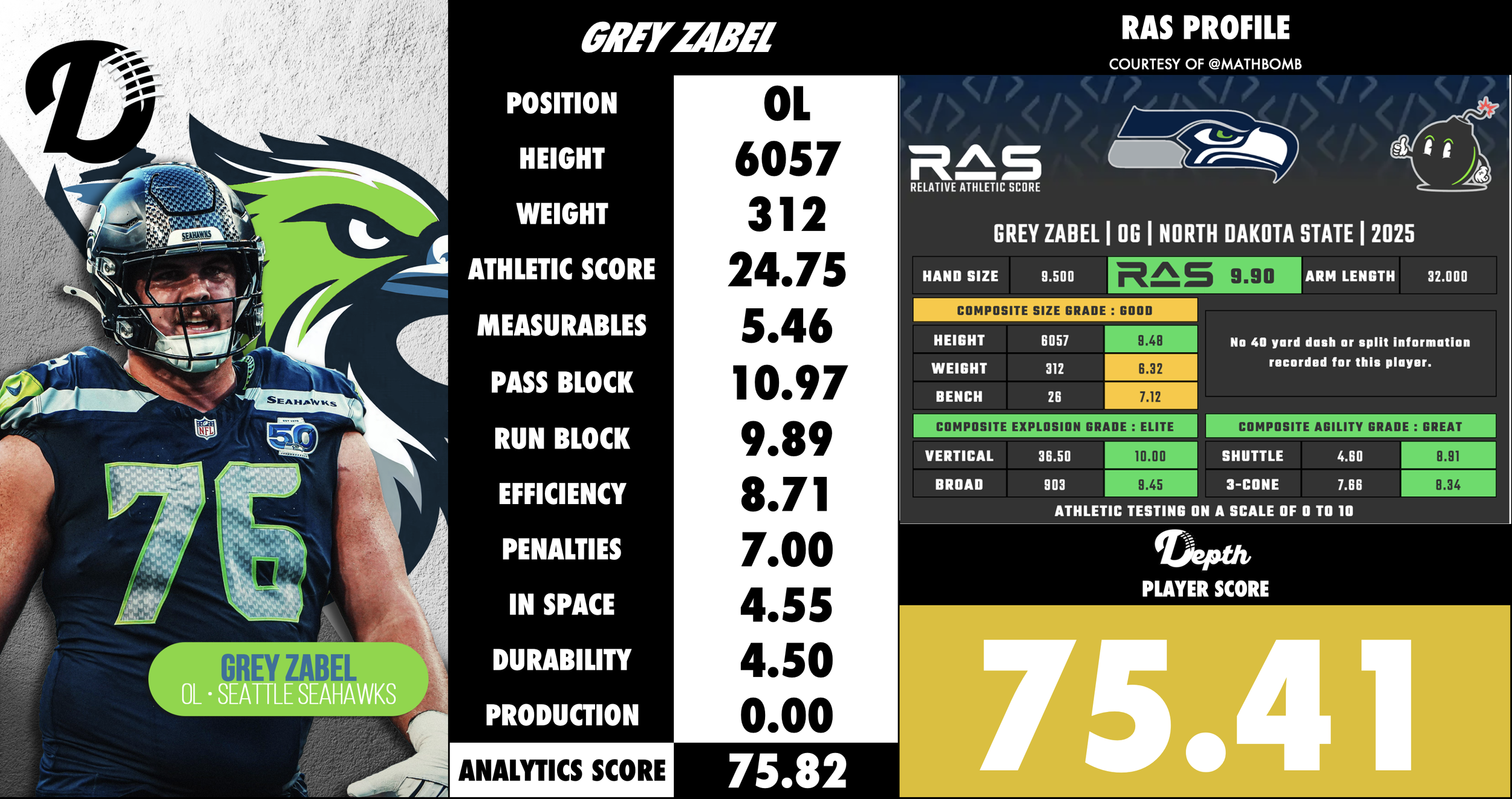 Elite Athleticism for the Position: Zabel posted standout athletic metrics for an interior lineman, including an outstanding RAS (Relative Athletic Score) and vertical/broad jump numbers — a strong indicator of movement ability and upside. Field Gulls