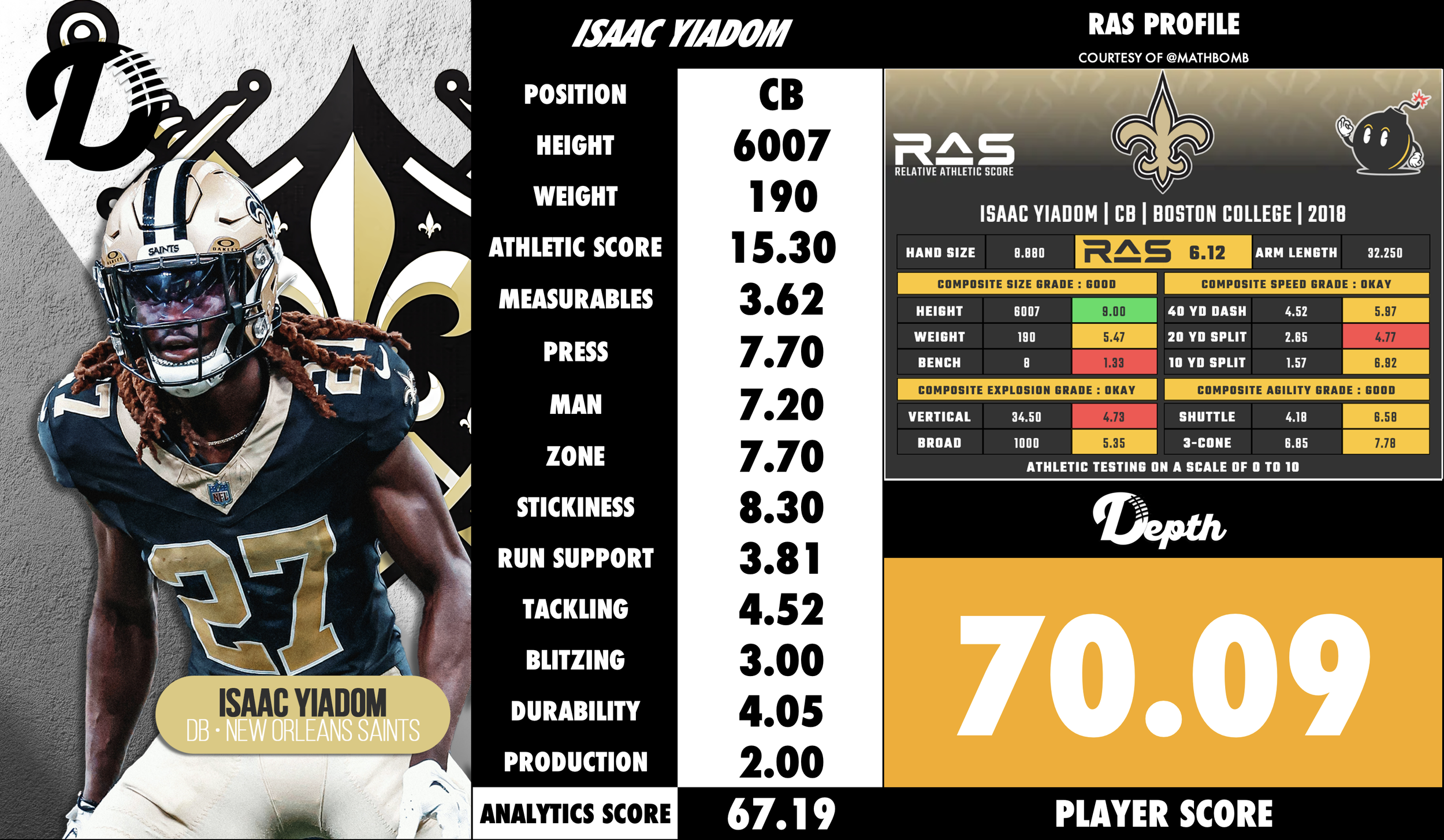 Size/length profile: Yiadom stands approximately 6‑1 with long arms, giving him the ability to contest passes, disrupt at the catch point and match up physically with larger receivers.