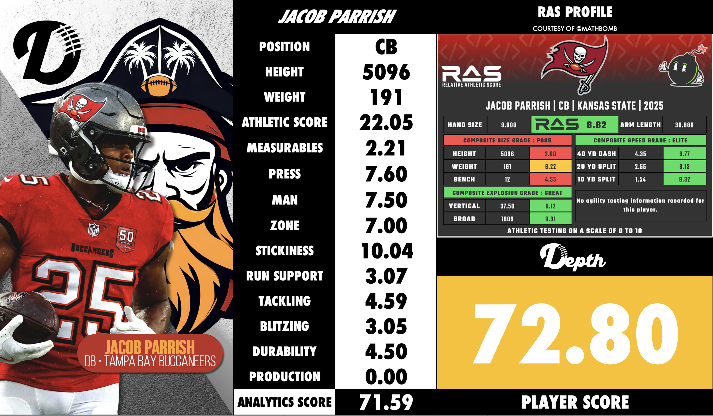 Jacob Parrish was selected in the 3rd round (84th overall) of the 2025 NFL Draft by the Tampa Bay Buccaneers. https://www.kctv5.com He played college football at Kansas State, where over three seasons he appeared in 38 games (24 starts), totaling 108 tackles, 5.5 tackles for loss, 5 interceptions, and 19 pass breakups. Bucs Nation He earned All–Big 12 Honorable Mention honors in both 2023 and 2024. https://www.kctv5.com At the NFL Combine, he ran a blazing 4.35‑second 40-yard dash, showing elite straight-line speed. Sportskeeda Known for his competitive nature, physicality, and willingness to tackle, Parrish brings a strong work ethic and versatility to his role as a defensive back. SI