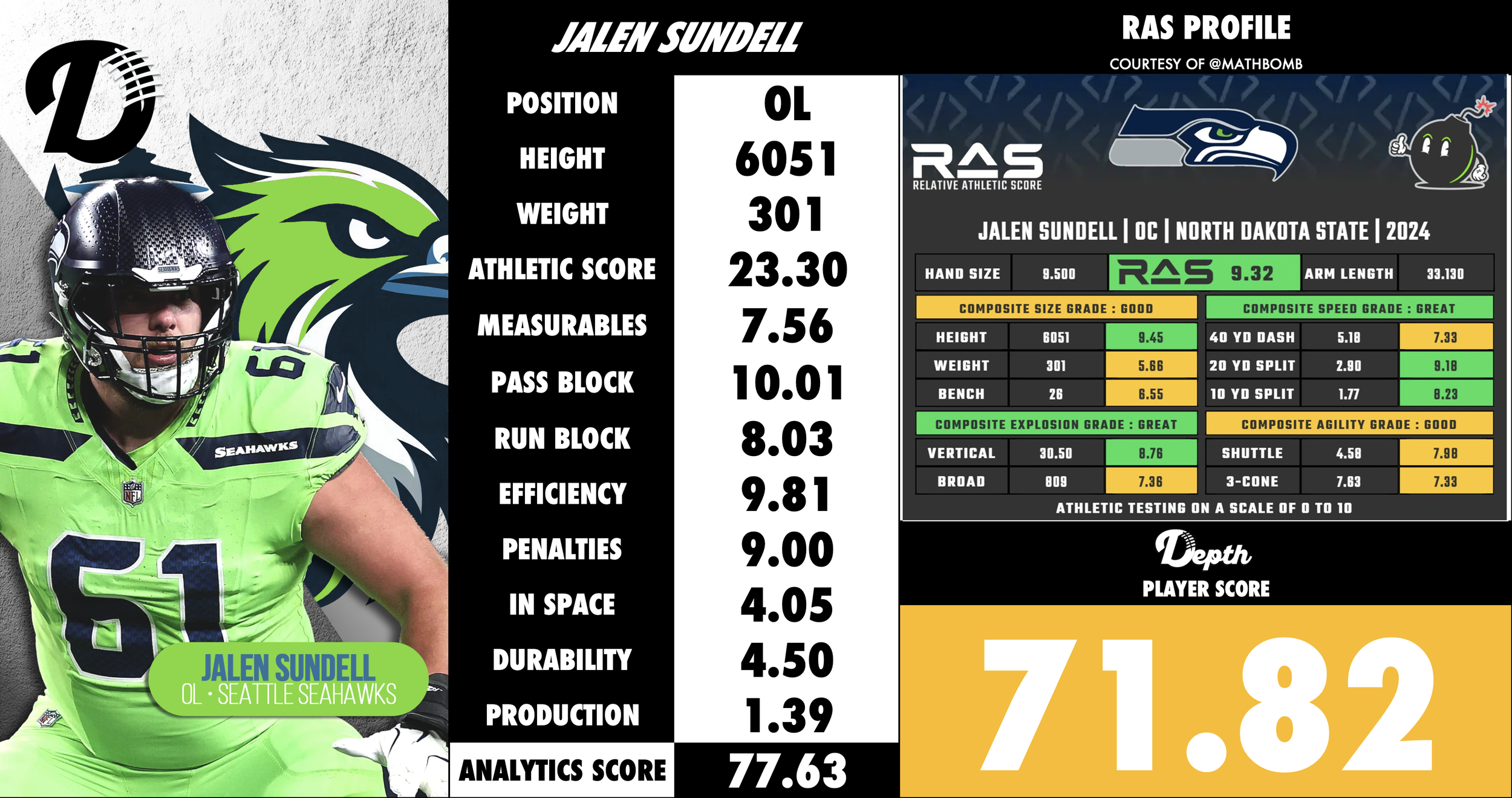 Jalen Sundell went undrafted in the 2024 Class out of North Dakota State University. Sundell is a promising young interior offensive lineman whose biggest strengths are versatility, mobility for his size, strong run‑block potential, and a winning background. His developmental tasks include refining his center‑specific technique, improving consistency in pass‑protection, and proving durability. If he continues his upward trend, he could become a key fixture on Seattle’s offensive line for years to come.