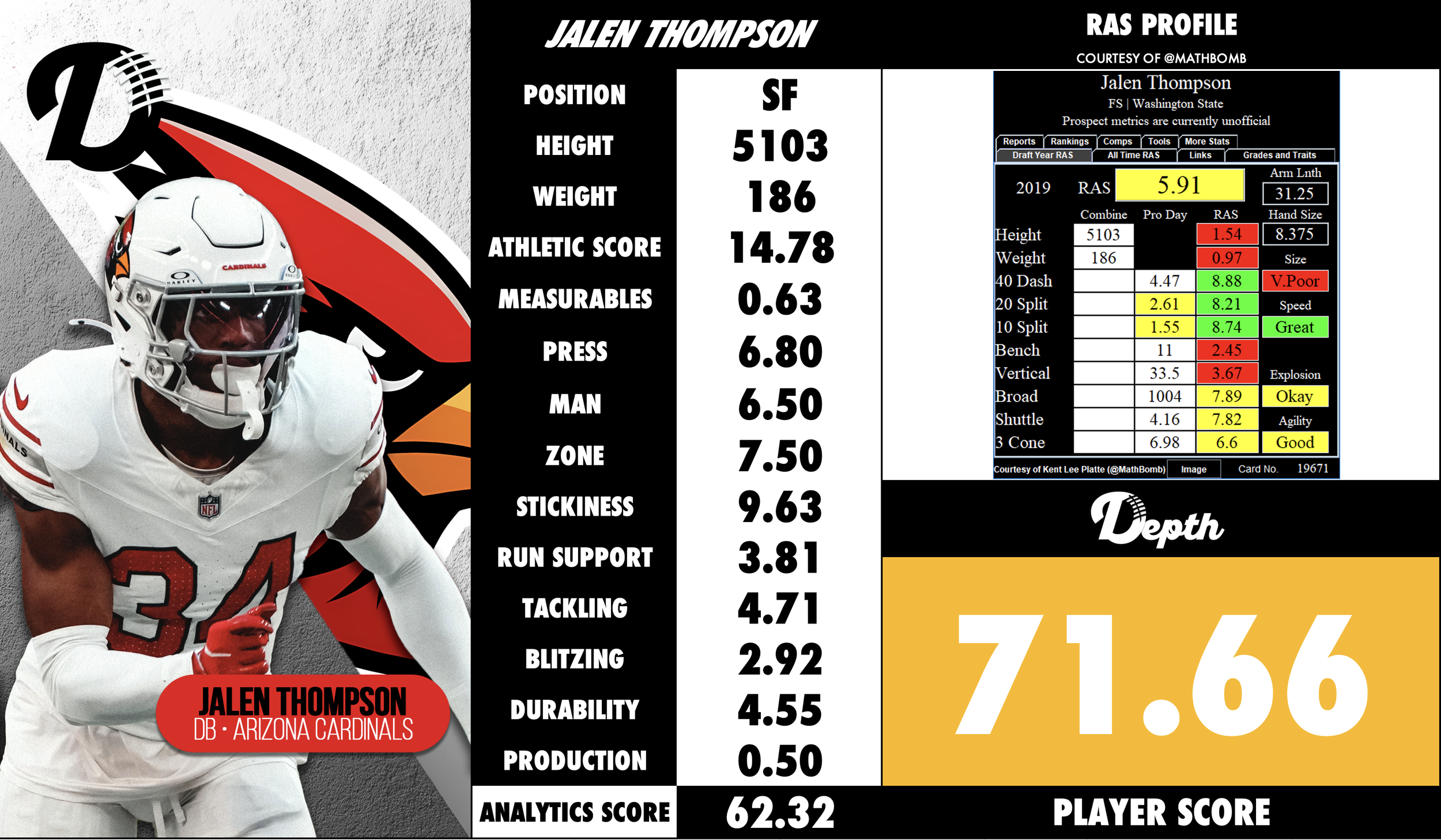 Jalen Thompson fits best as a starting safety in a defense that values multiple roles — someone who can handle deep coverage, support the run, and occasionally blitz. In Arizona’s scheme, he is especially valuable because he can play near the line of scrimmage, make tackles, and also drop into coverage. Looking ahead, he projects as a core defensive back, particularly if the Cardinals or any future team continue to build a safety pairing. His high motor, experience, and versatility make him an asset for multiple defensive fronts. While he may not be the flashiest safety, his consistent production and football IQ give him a strong outlook as a trusted piece in the secondary.