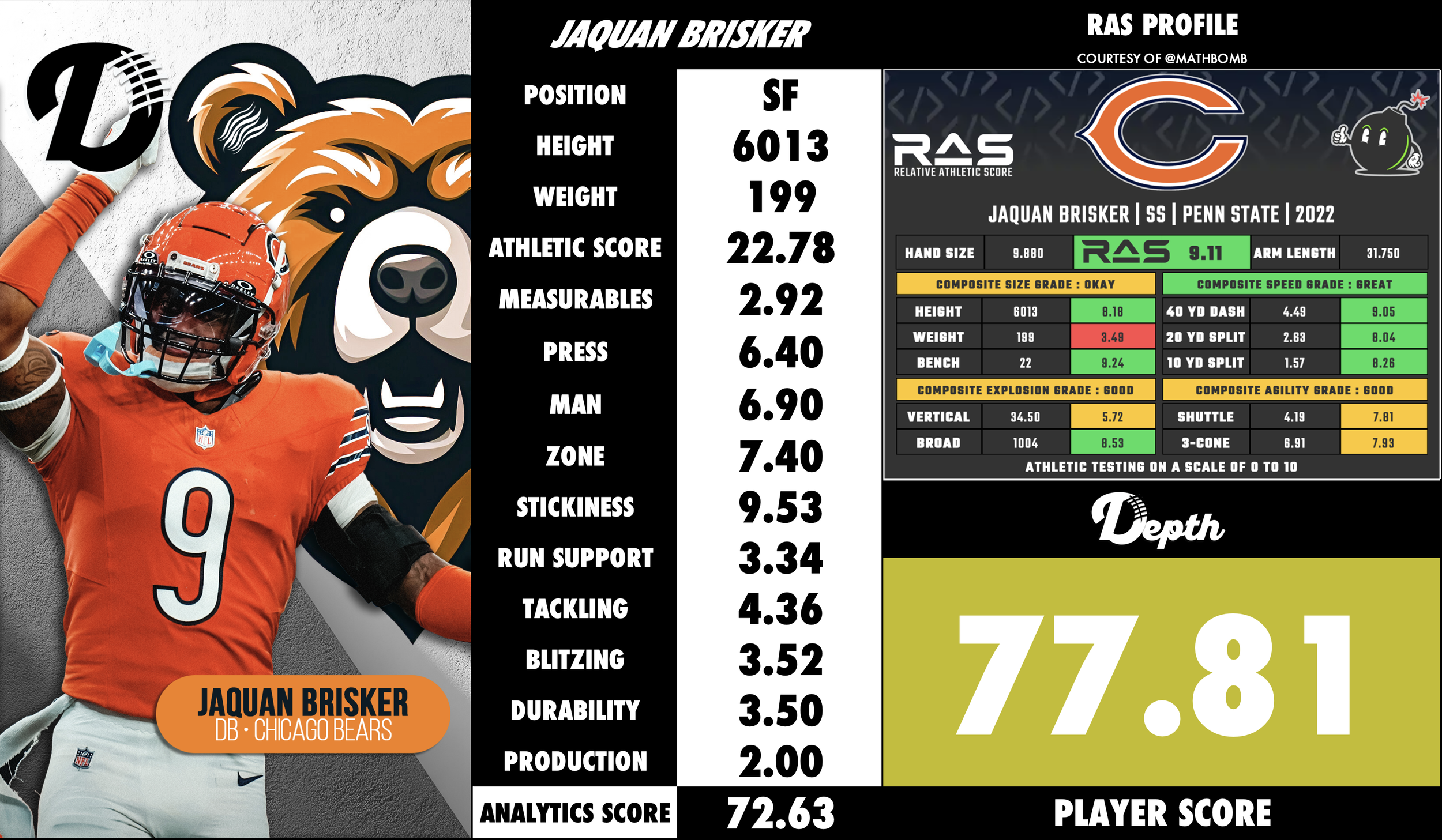 Jaquan Brisker is a physical, versatile safety known for his aggressive tackling, range, and instinctive play in both run support and pass coverage. Coming out of Penn State, he displayed the ability to cover slot receivers, tight ends, and running backs, while excelling in run fits and tackling.