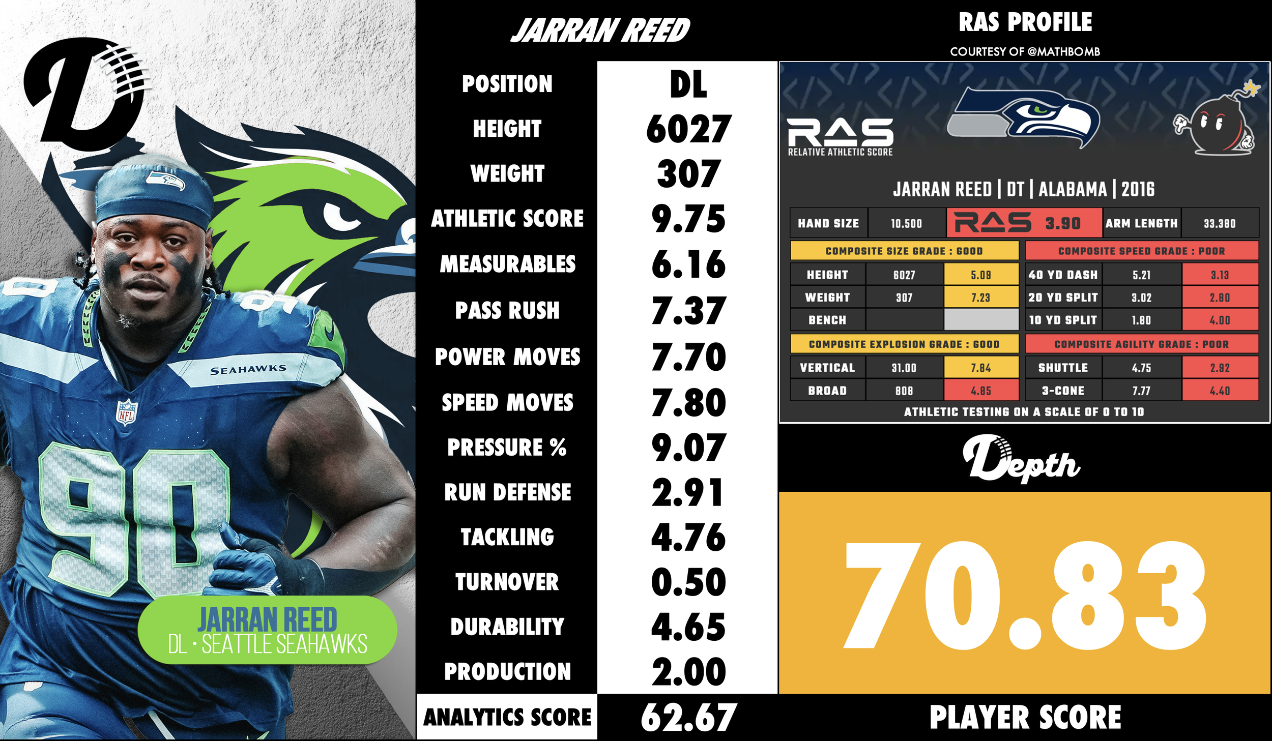Jarran Reed was selected in Round 2 (#49 Overall) in the 2016 Draft out of University of Alabama. Reed is a physically powerful interior defensive lineman with proven ability to disrupt plays in both the run and pass game. His strengths are his power, run-stopping, and interior pass-rush ability, while weaknesses include injury history, limited versatility, and reliance on power over technical finesse. Overall, he remains a reliable, impactful defensive tackle in schemes that utilize his strengths.