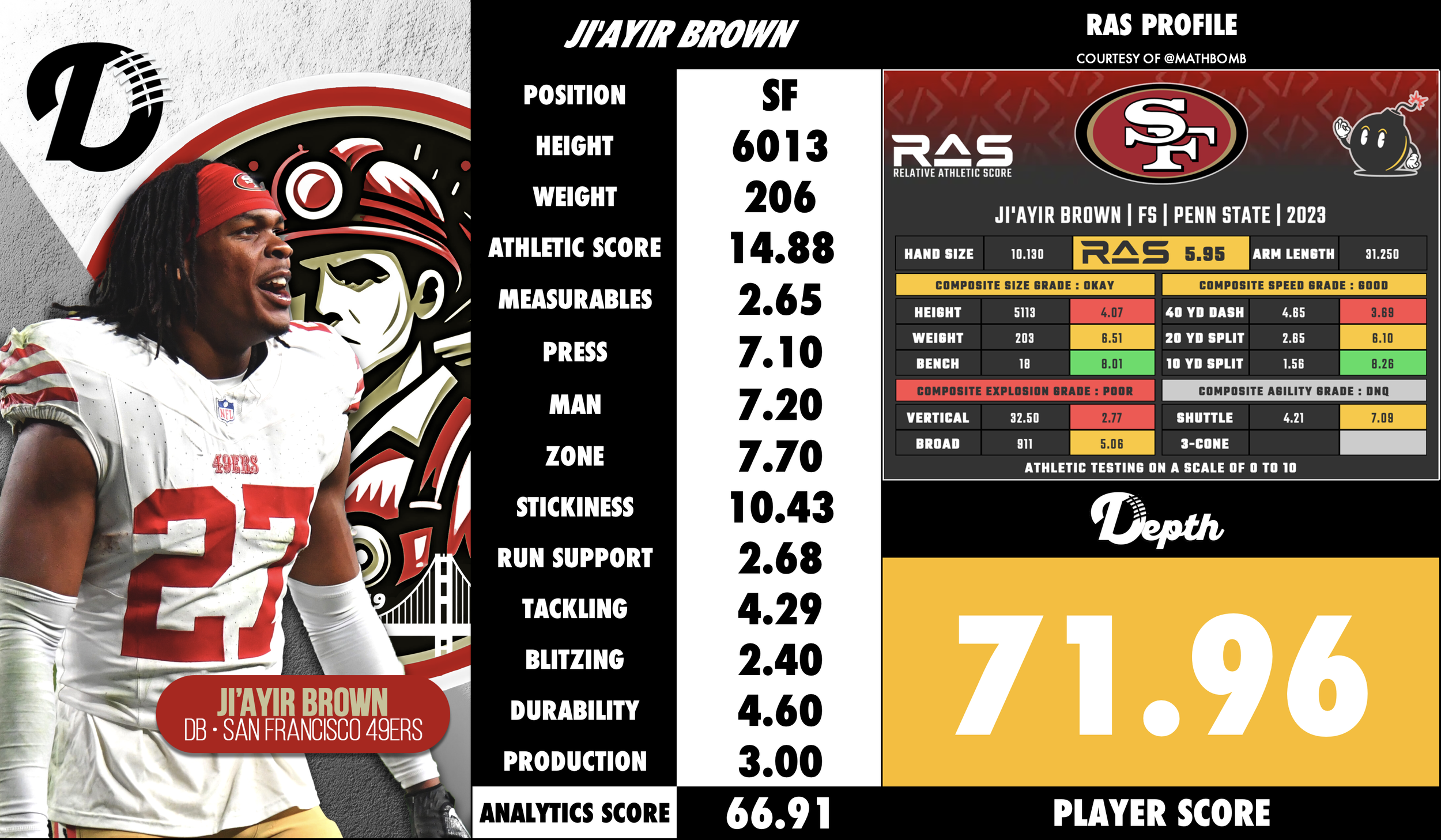 Ji’Ayir Brown has the tools and the instincts to become a very good safety in the NFL—particularly the type who can be used in multiple capacities (coverage, box play, blitzing). He is already contributing for the 49ers and showing promise. The key for him going forward will be: