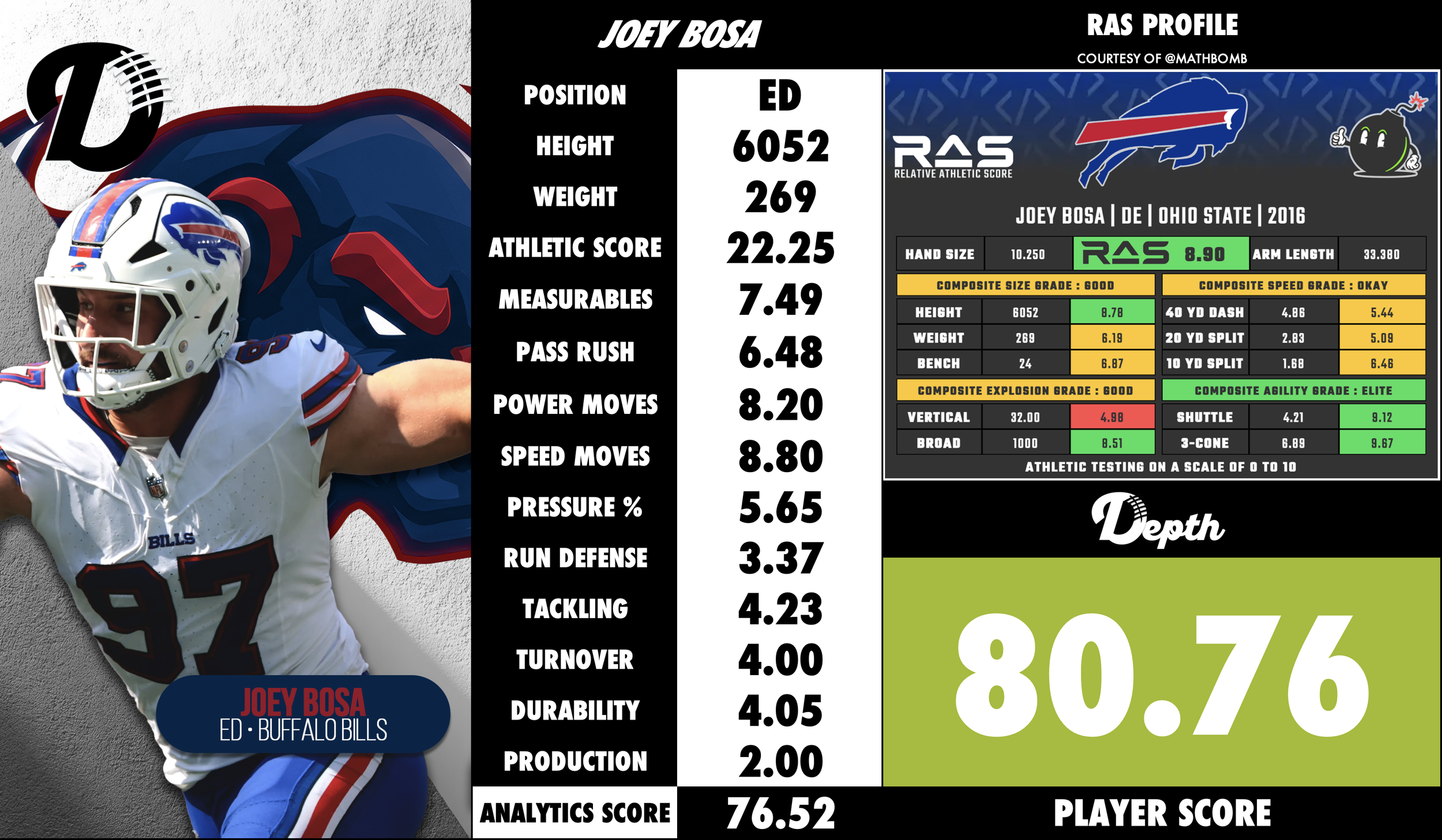 Proven production when healthy: Earlier in his career especially, Bosa recorded several seasons of high sack totals, showing a ceiling as a top-tier pass rusher. Buffalo Bills