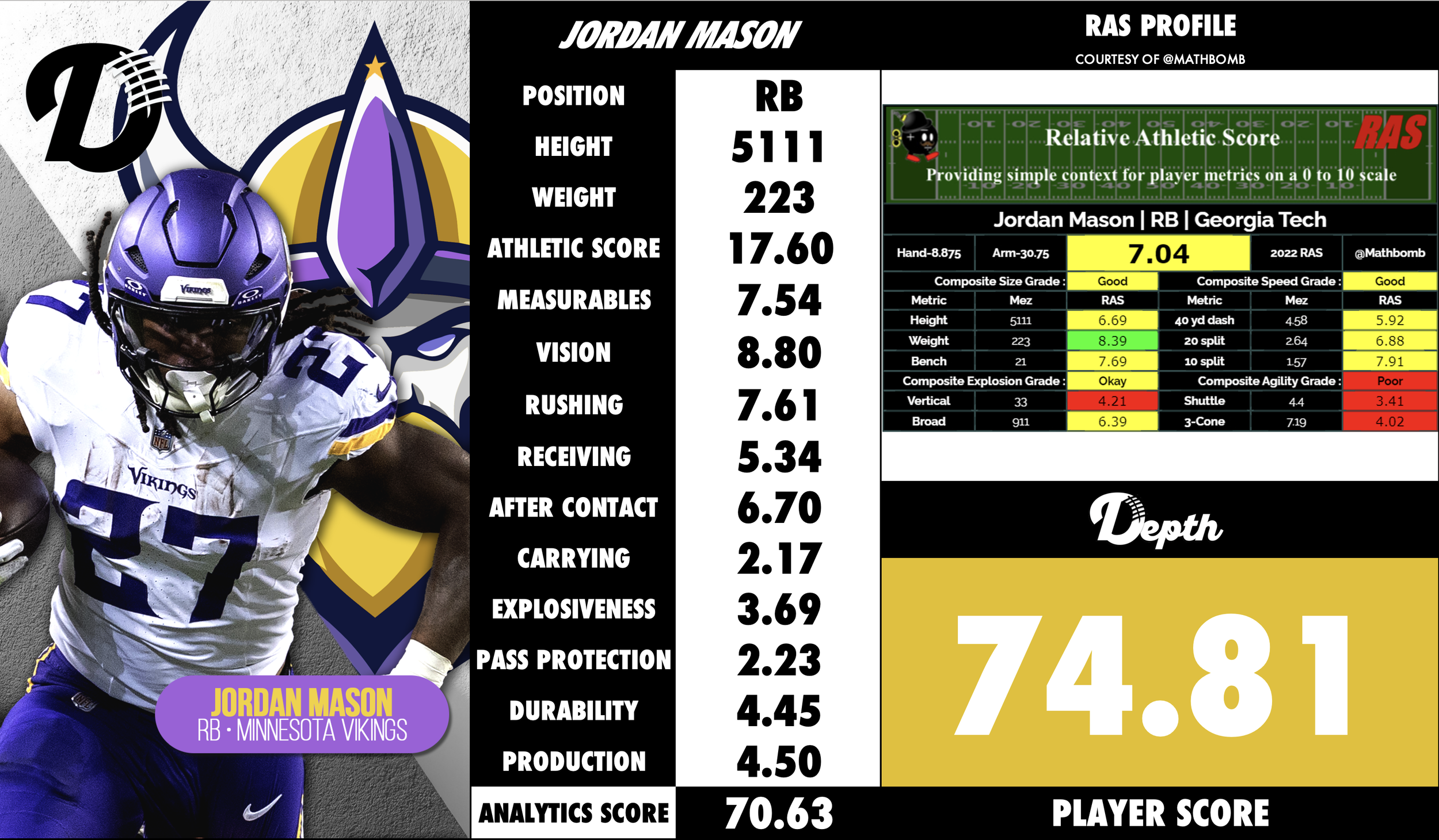 Strong lower-body build for his size: At around 223-230 lbs and with a compact frame, Mason combines sufficient mass with athleticism, allowing him to run effectively between the tackles and bounce runs to the edge.