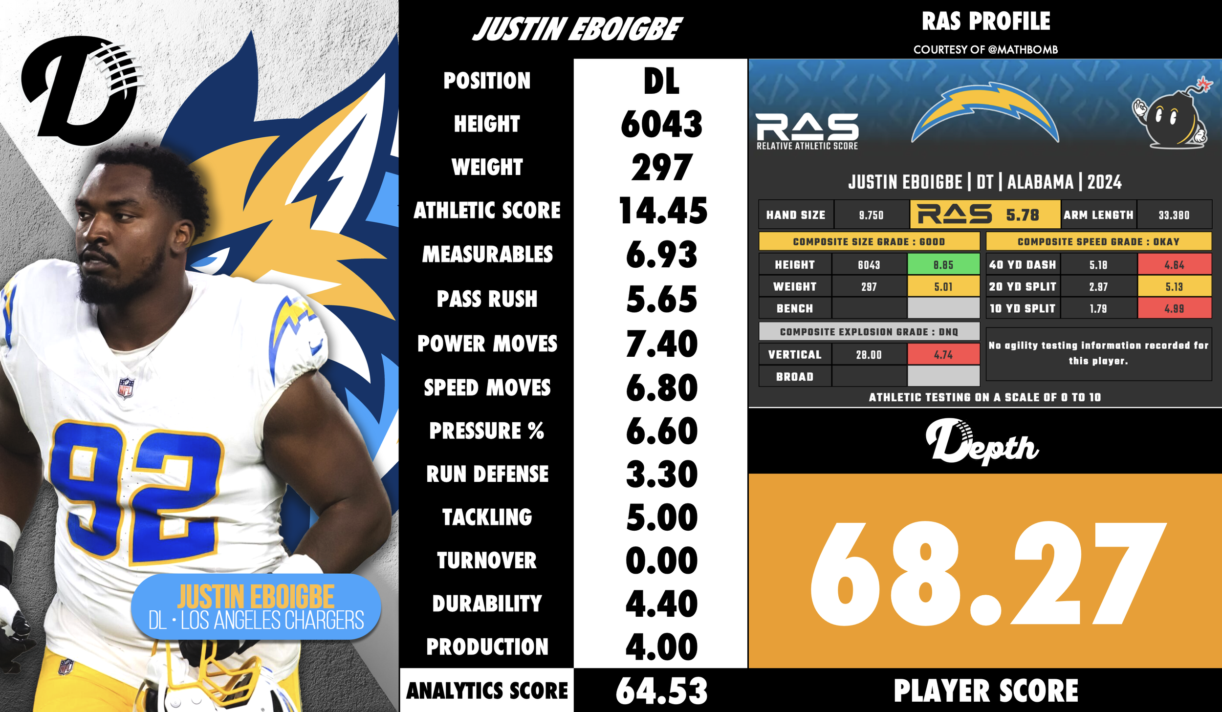 Drafted: Round 4, 105th overall (2024) by the Los Angeles Chargers. College: Alabama. Key college notes: steady progression at Alabama with a breakout 2023 season (led team in pressures, 7.0 sacks in 2023; First-team All-SEC). Entered the NFL as a 6'5", ~292 lb defensive end with good interior/edge versatility and a comeback story after a 2022 neck injury. Character: praised for toughness and work ethic while returning from injury and finishing his college career strongly. Alabama Athletics