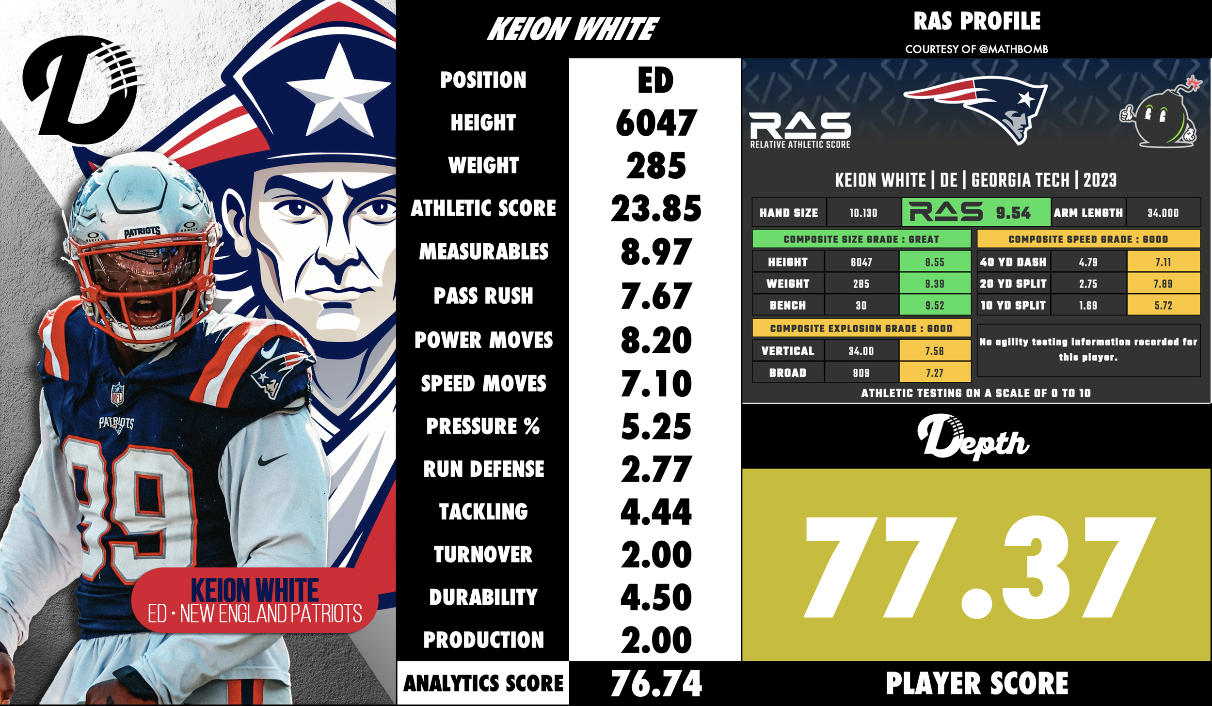 Run-defense potential: While more celebrated for his pass rush, he has shown ability to set the edge, make tackles for loss, and disrupt the backfield as evidenced in his college TFL numbers. Georgia Tech Yellow Jackets
