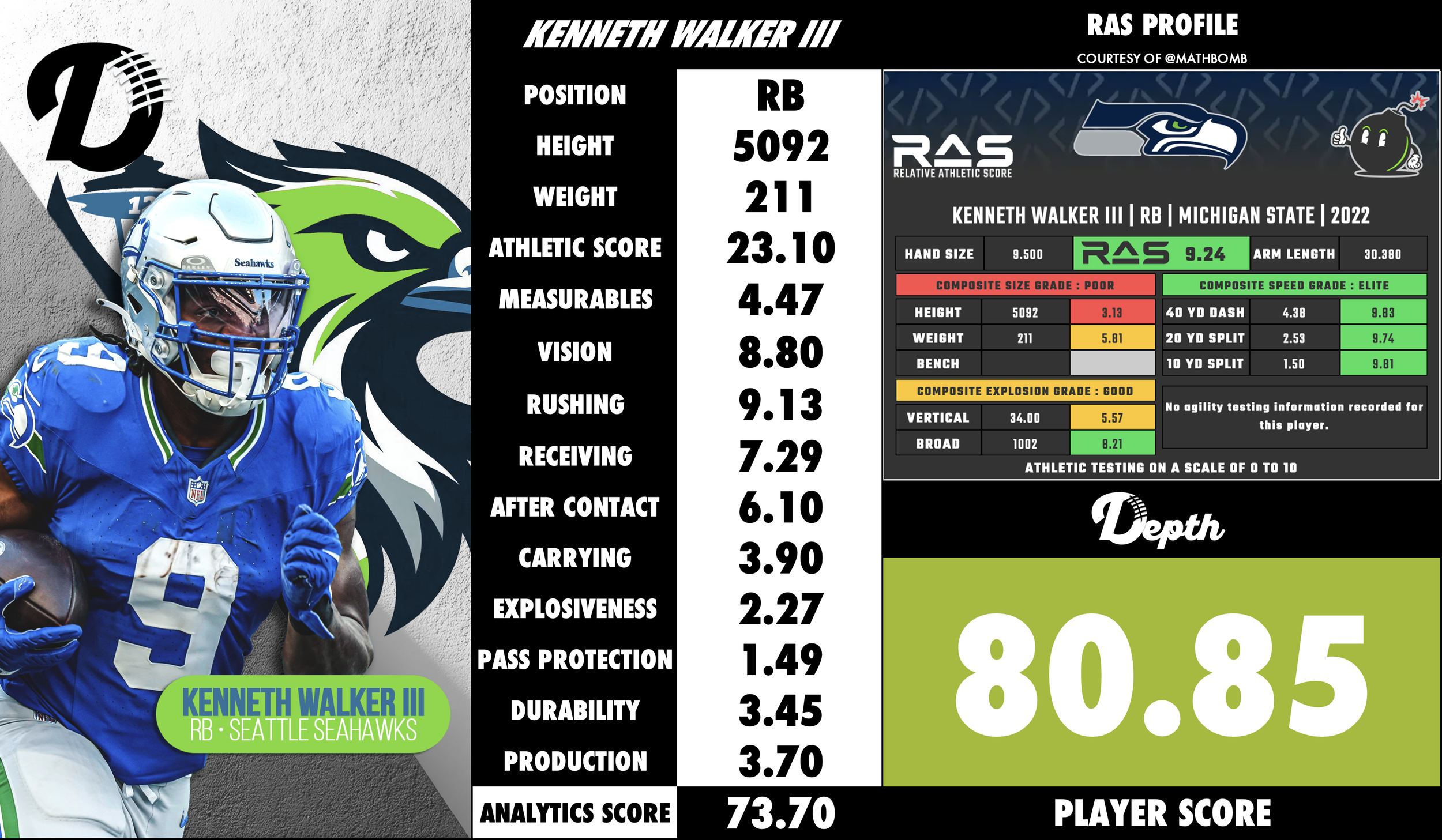 Kenneth Walker III was selected in Round 2 (#41 Overall) in the 2022 Draft out of Michigan State University. Walker is an exciting young running back whose major strengths lie in his explosiveness, contact balance, vision, and receiving potential. His main developmental tasks include improving his durability, honing his pass‑protection and blocking skills, and refining his decision‑making in smaller‑space scenarios. If he can address these areas, he has a very high upside; even if not, he still offers valuable contributions as a dynamic starter.