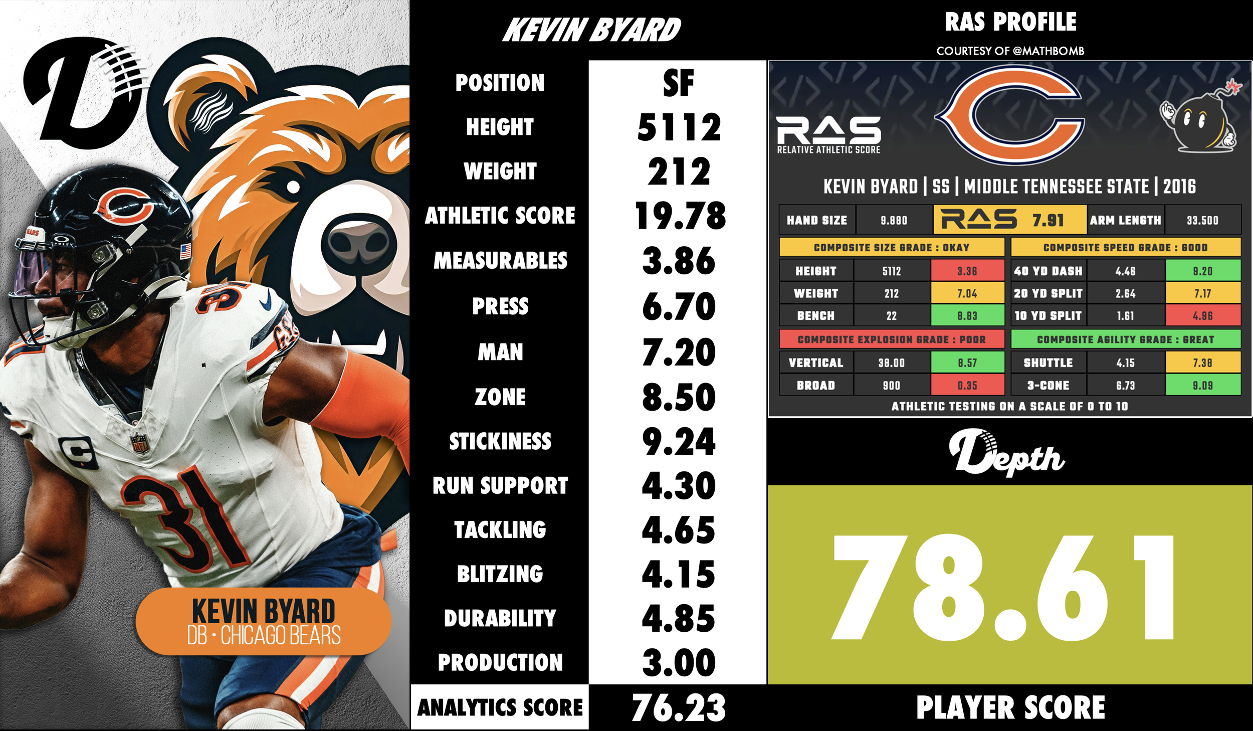 Kevin Byard remains a cornerstone safety for any NFL defense. Even as he ages, his intelligence, anticipation, and leadership allow him to stay highly effective. While he may lose a step in pure speed over time, his instincts and understanding of the game make him a valuable contributor well into his veteran years. He is a proven playmaker and a key figure in any defensive backfield.