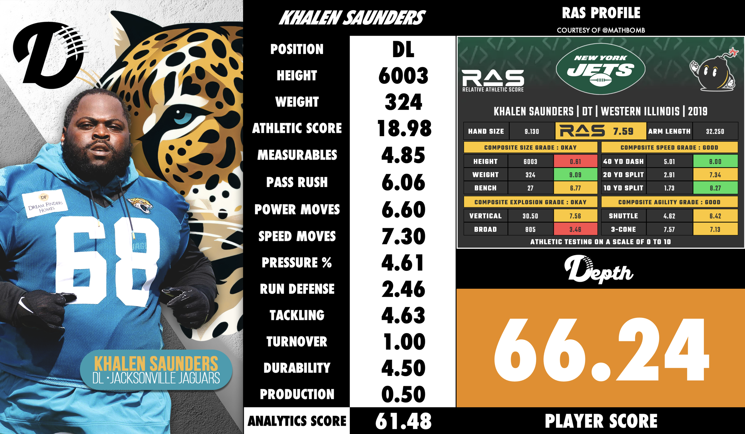 Khalen Saunders was selected in the 3rd Round (#84 Overall) in the 2019 Draft out of Western Illinois University. Saunders is a well‑built interior defensive lineman whose strengths lie in his compact power, gap‑penetration ability, and experience in successful teams. While not the tallest or longest at his position, he uses leverage and athleticism to his advantage. The main constraints are production volume (especially pass‑rush) relative to elite counterparts, anchoring power in heavy run‑schemes, and durability/readiness. With his recent move to the Jaguars and if he continues developing, Saunders projects as a valuable starter or key rotational piece who can make meaningful contributions and possibly step into a higher tier with the right refinement.