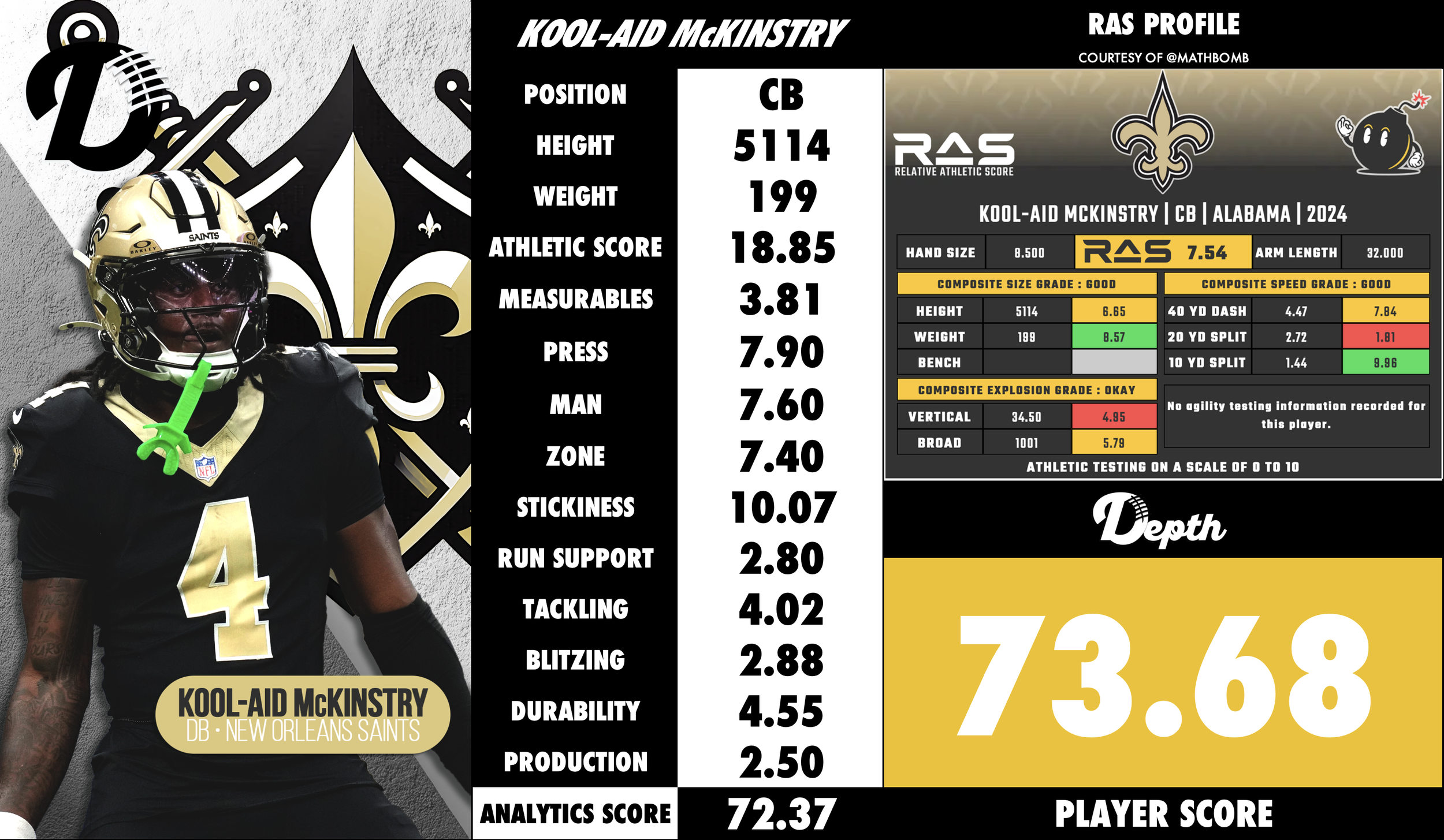 Kool‑Aid McKinstry is a highly capable young cornerback whose strengths center around size, press coverage ability, ball skills, and special‑teams versatility. His key developmental tasks will be improving short‑area agility, increasing interception frequency, enhancing flexibility in different coverage schemes, and sharpening tackling/engagement strength. With steady progression, he could become a cornerstone of the Saints’ secondary for years to come.