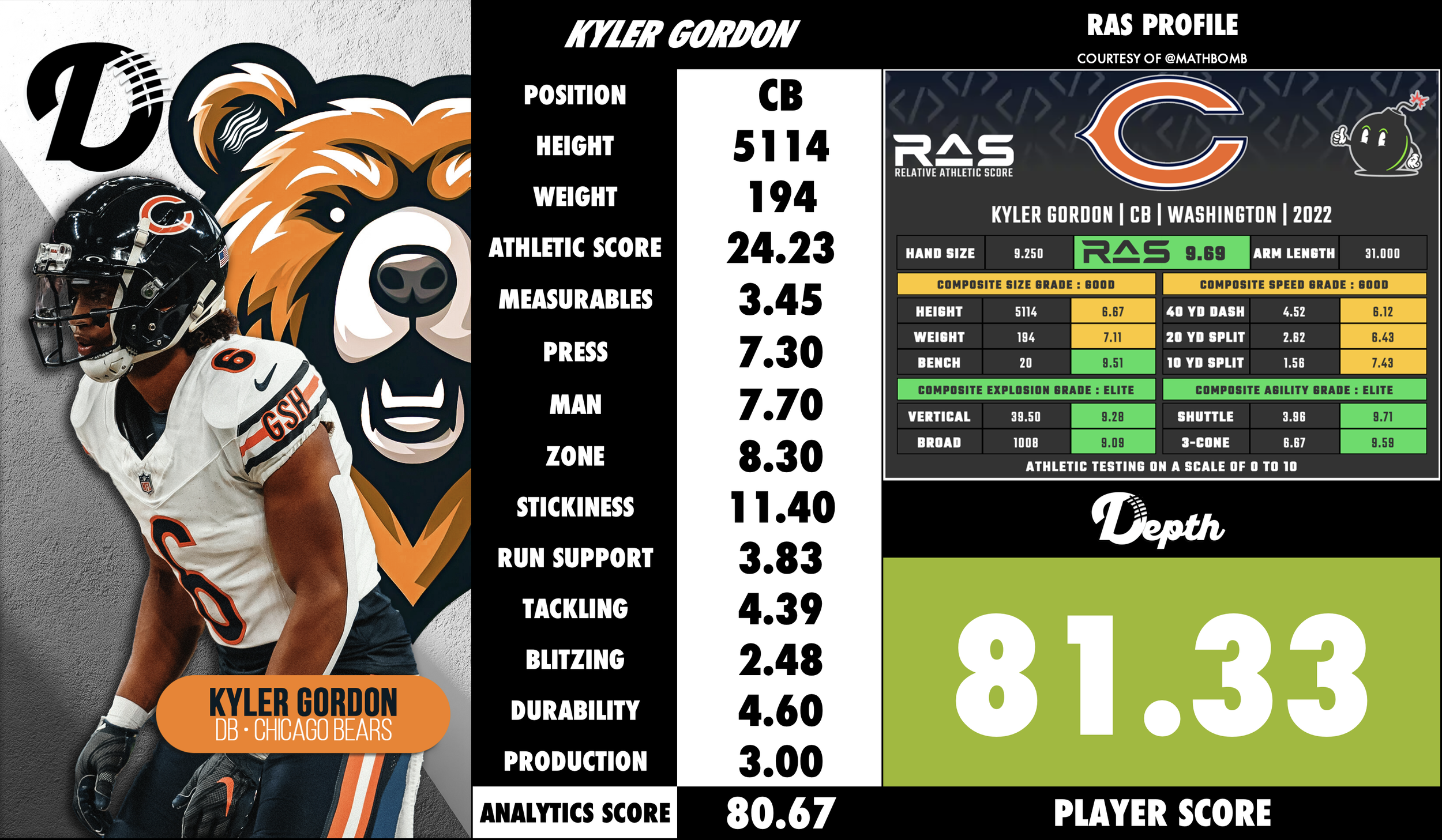 Kyler Gordon is a cornerback for the Chicago Bears, who entered the NFL in 2022, Round 2, (pick 39) after being drafted out of the Washington Huskies. He stands 6′0″, weighs around 200 lbs, and at the collegiate level developed a reputation for his athleticism, positional versatility, and ball-skills. Bleacher Report