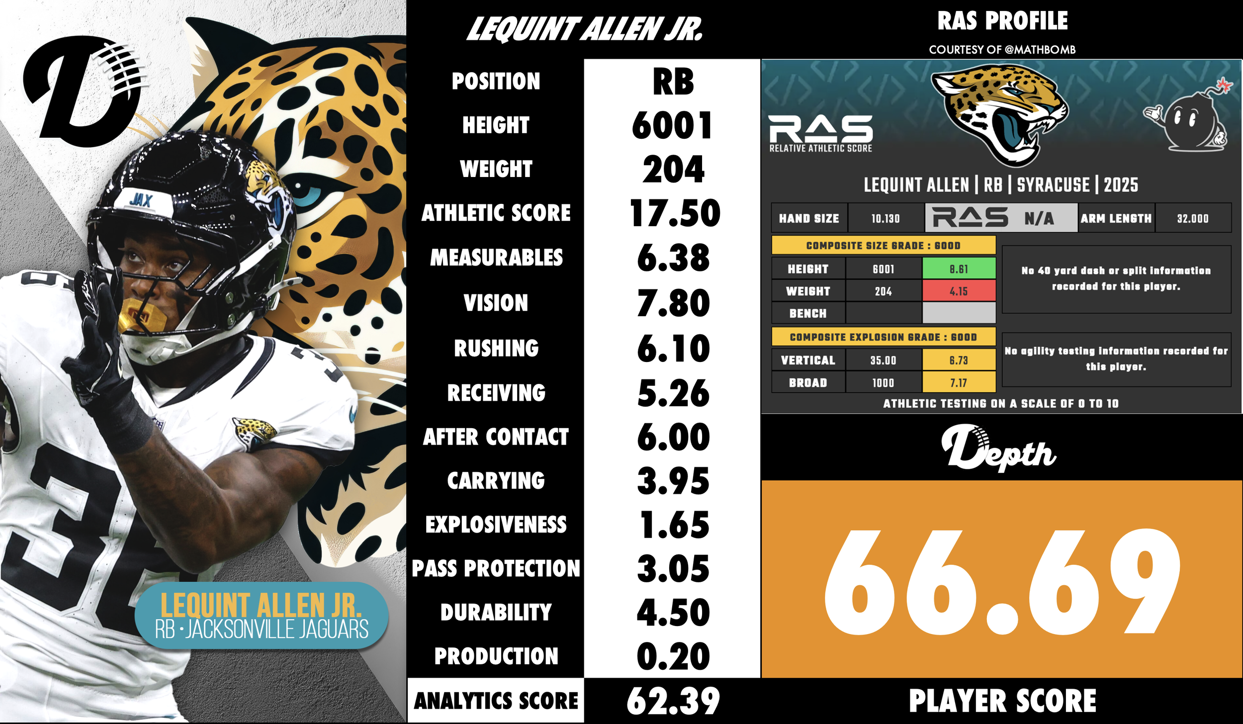 LeQuint Allen Jr. was selected in the 7th Round (#236 Overall) in the 2025 Draft out of Syracuse. Allen plays the game like a werewolf and his standout traits are his dual‑threat ability (rushing + receiving), solid fundamental skills, and versatility. His production at Syracuse (back‑to‑back 1,000‑yard seasons and over 500 receiving yards in his last year) show he can operate in multiple phases of offense. However, as a seventh‑round pick, he enters the NFL with less hype for high volume and more expectation to carve out a specific role. If he develops his explosion, resolves any efficiency concerns, and shows reliability in pass protection and special teams, he has the tools to become a valuable contributor. Otherwise, his early career will likely see him working in committee roles and carving out his niche for the long term.