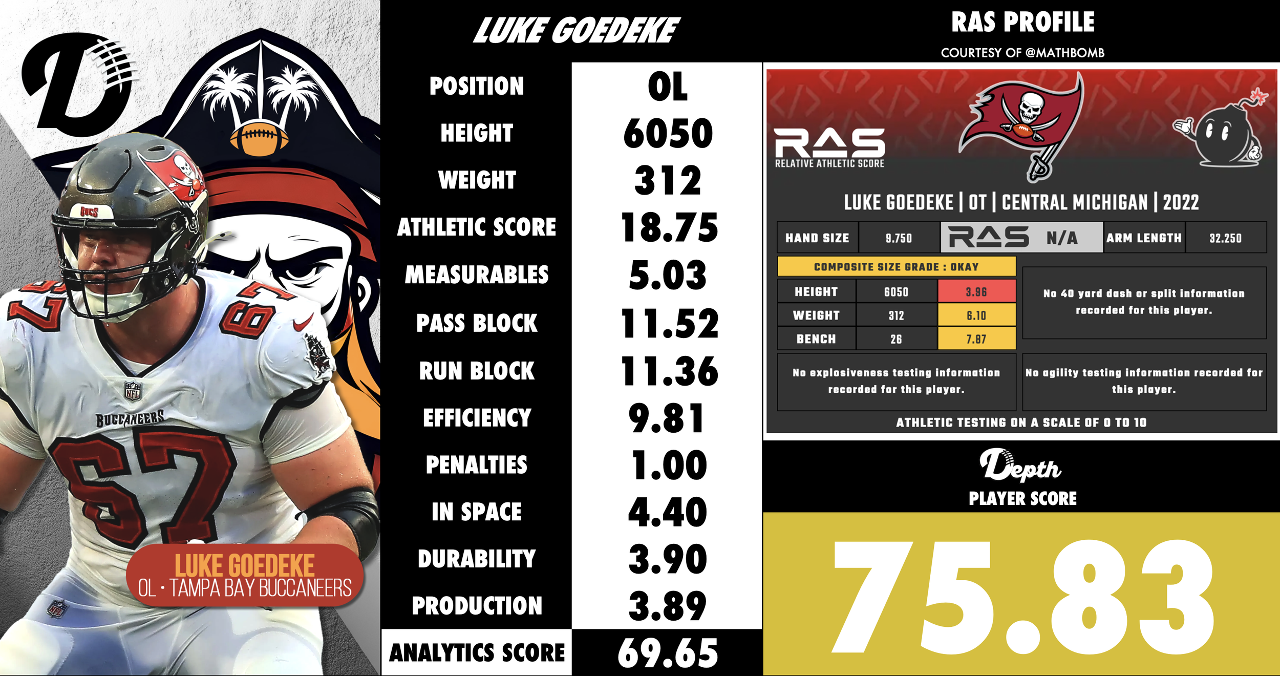 Luke Goedeke was selected in the 2nd round (57th overall) of the 2022 NFL Draft by the Tampa Bay Buccaneers. Tampa Bay Buccaneers He played college football at Central Michigan University, where he was First-Team All-MAC in 2021. NFL Draft Buzz Goedeke originally played tight end at Wisconsin–Stevens Point before converting to offensive line at CMU. In college, he demonstrated strong blocking performance—during his 2021 season, he allowed just 7 total pressures and no sacks. NFL Draft Buzz In the NFL, he has started many games for Tampa Bay (40+ starts as of 2025). Goedeke is known for his work-ethic, versatility (tackle / guard), and physical tenacity. Pewter Report