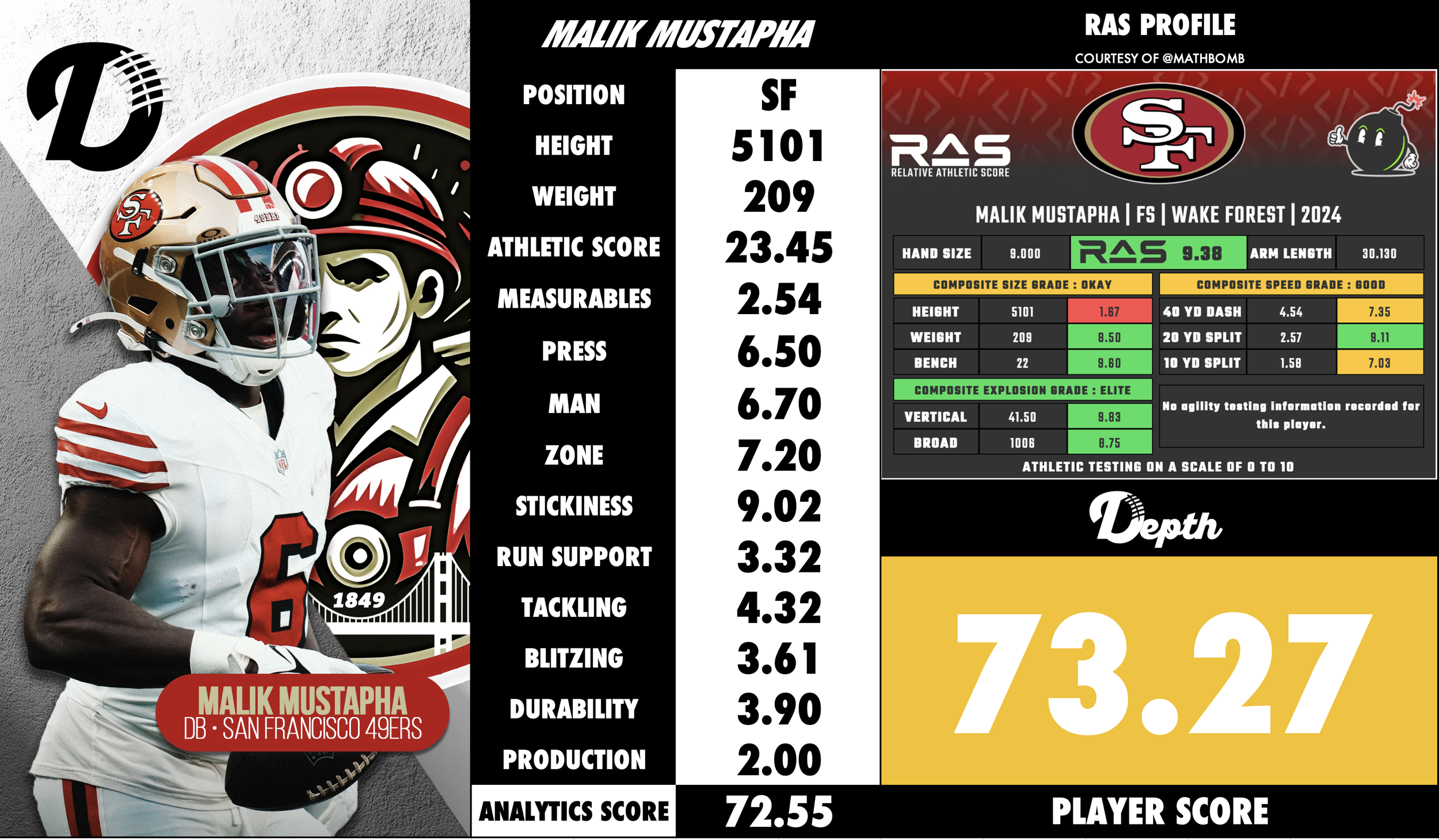 Malik Mustapha is a safety for the San Francisco 49ers who was selected in the 4th round, 124th overall, of the 2024 NFL Draft. San Francisco 49ers A former standout at Wake Forest Demon Deacons (after transferring from Richmond), Mustapha made an immediate impact in his rookie season—starting 12 games, registering 72 tackles, one interception, and five passes defended across 16 games. CBS Sports His physicality, instincts and positional versatility give him a strong foundation, though his size, experience and injury history present areas for improvement.